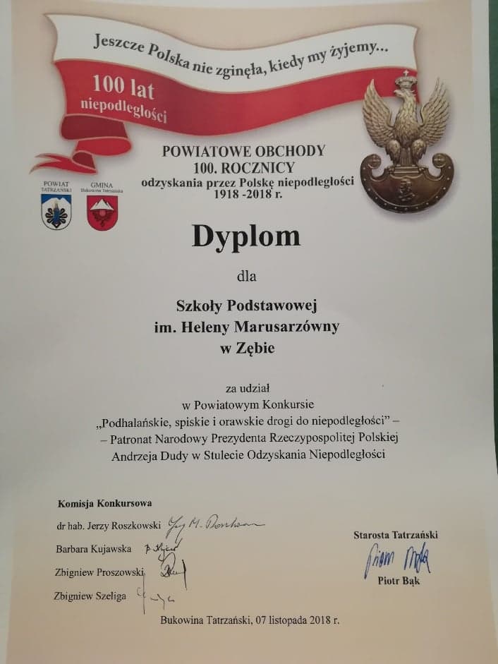 W środę 7 listopada br. uczniowie Szkoły Podstawowej z Zębie: Julka Maryniarczyk, Kamil Wójcik oraz Marcin Papież jako zwycięzcy etapu gminnego, reprezentowali gminę Poronin w finale konkursu powiatowego "Podhalańskie i spiskie drogi do niepodległości". Tegorocznym motywem przewodnim konkursu był temat „BOHATEROWIE NIEPODLEGŁEJ”. Opiekunem był pan Bronisław Chowaniec Lejczyk.