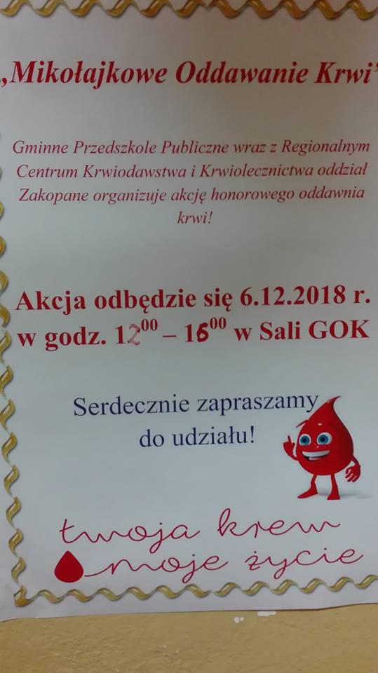 Gminne Przedszkole Publiczne w Poroninie wraz z Regionalnym Centrum Krwiodawstwa i Krwiolecznictwa oddział Zakopane organizuje "Mikołajkowe Oddawanie Krwi" Akcja odbędzie się 6.12.2018 r. w Gminnym Przedszkolu Publicznym w Poroninie (sala GOK) w godzinach 12:00 - 16:00.