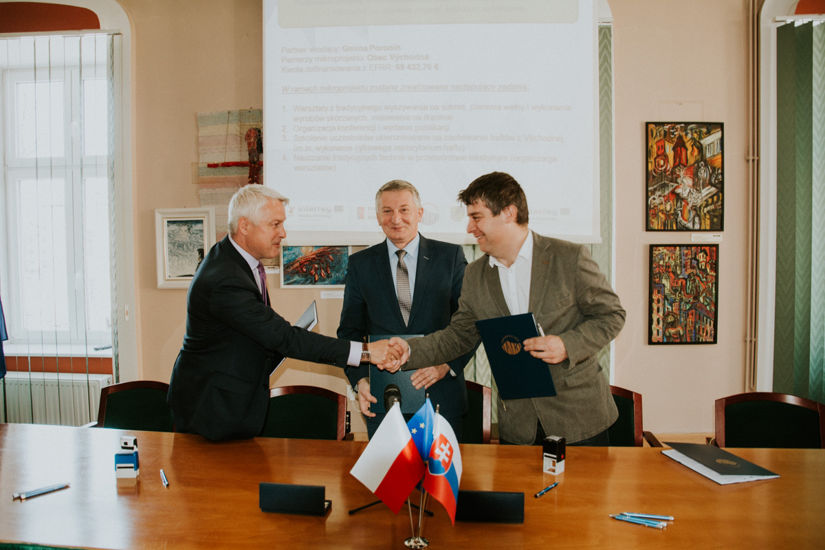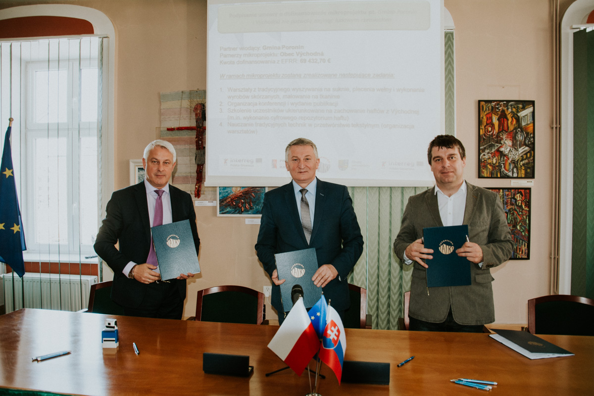 W dniu 19 kwietnia 2018 roku w siedzibie Związku Euroregionu „Tatry” w Nowym Targu Andrzej Buńda – Zastępca Wójta Gminy Poronini Ing. Juraja Blaška – Starosta Obce Východná podpisali umowę o dofinansowanie mikroprojektu pn. „Gmina Poronin i Východná nie pozwolą zaginąć ludowym rzemiosłom” w ramach Programu Współpracy Transgranicznej Interreg V-A Polska – Słowacja 2014-2020.