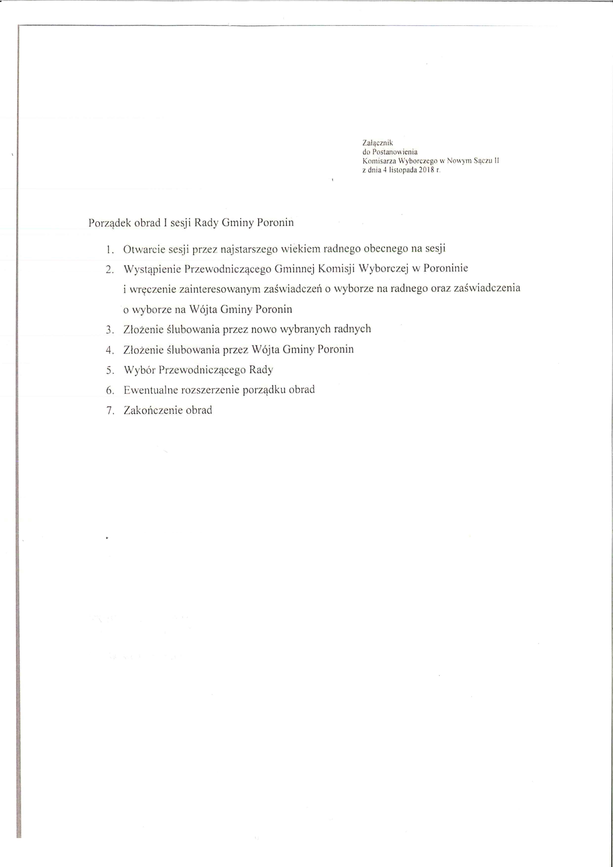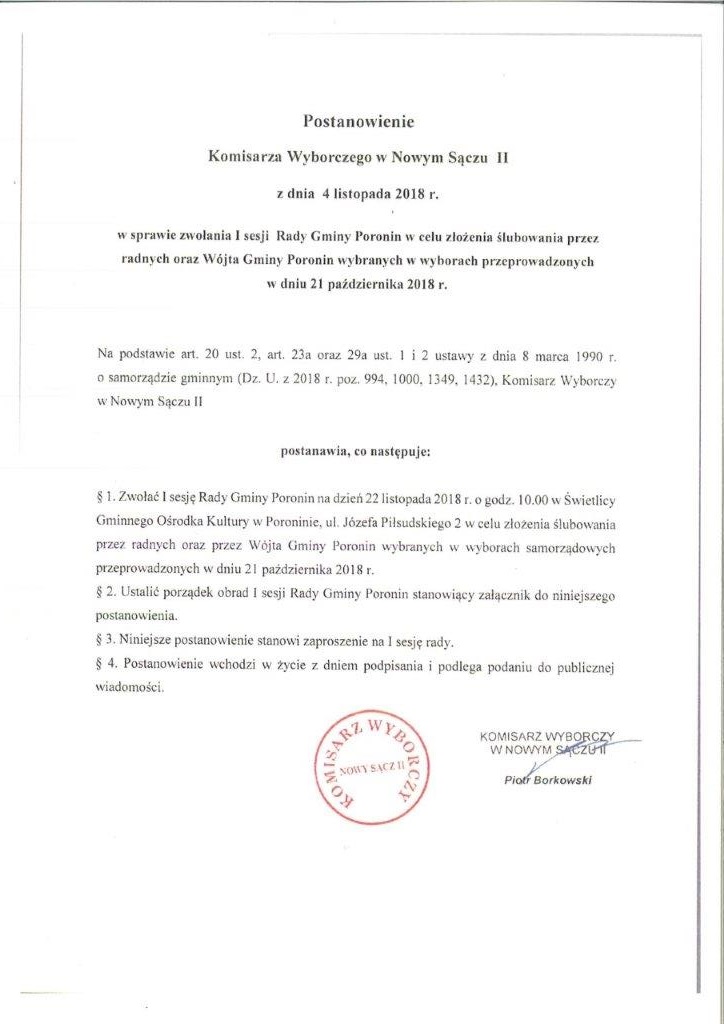 Postanowienie Komisarza Wyborczego w Nowym Sączu II z dnia 4 listopada 2018 r. w sprawie zwołania I sesji Rady Gminy Poronin w celu złożenia ślubowania przez radnych oraz Wojta Gminy Poronin wybranych w wyborach przeprowadzonych w dniu 21 października 2018 r.