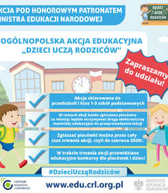 Centrum Rozwoju Lokalnego serdecznie zaprasza wszystkie przedszkola i klasy 1-3 szkół podstawowych do udziału w objętej honorowym patronatem Ministra Edukacji Narodowej ogólnopolskiej, trwającej do końca roku szkolnego 2019/2020 akcji edukacyjnej pn. "Dzieci uczą rodziców". Celem akcji wsparcie procesu edukacji najmłodszych, a także zachęcenie ich do rozmowy z rodzicami na tematy będące przedmiotem lekcji przeprowadzonych podczas akcji "Dzieci uczą rodziców".