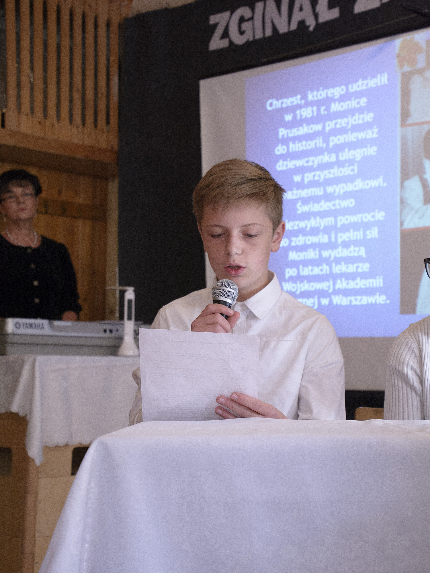Święto Patrona to szczególny dzień w życiu szkolnej społeczności. Jego wyjątkowy charakter, podkreślili swoją obecnością przedstawiciele władz Gminy Poronin – pani Wójt Anita Żegleń , Przewodniczący Rady pan Adam Pawlikowski, Sekretarz Gminy pani Maria Budz oraz Dyrektor Centrum Usług Wspólnych pani Beata Chałupka. Życzyli oni Dyrekcji, Gronu Pedagogicznemu i Rodzicom, aby duch Patrona wpisał się w program wychowawczy Szkoły. Uczniom zaś, aby wartości, którym był wierny ks. Popiełuszko pozostały dla nich drogowskazem.