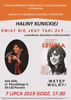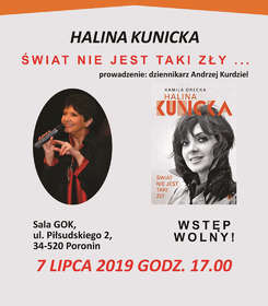 Gminna Biblioteka Publiczna w Poroninie zaprasza na spotkanie autorskie i minirecital Haliny Kunickiej, polskiej piosenkarki ,odznaczonej licznymi nagrodami branżowymi i odznaczeniami państwowymi. Halina Kunicka to autorka kilkunastu płyt, z których aż trzy doczekały się statusu złotych. Spotkanie autorskie "Świat nie jest taki zły..." odbędzie się 7 lipca o godz. 17.00 w sali Gminnego Ośrodka Kultury w Poroninie. Wstęp wolny. Serdecznie zapraszamy!