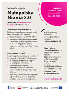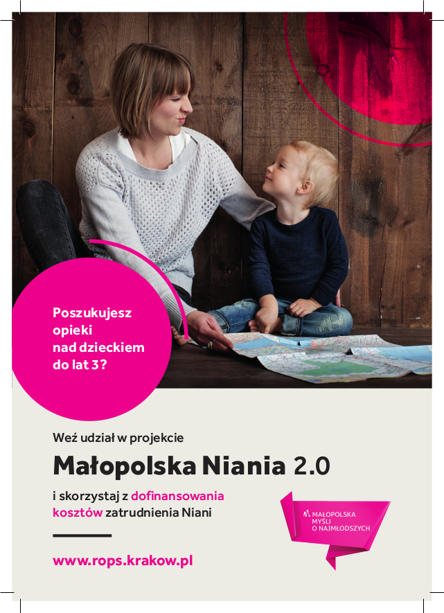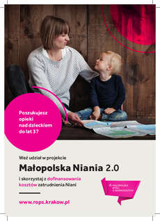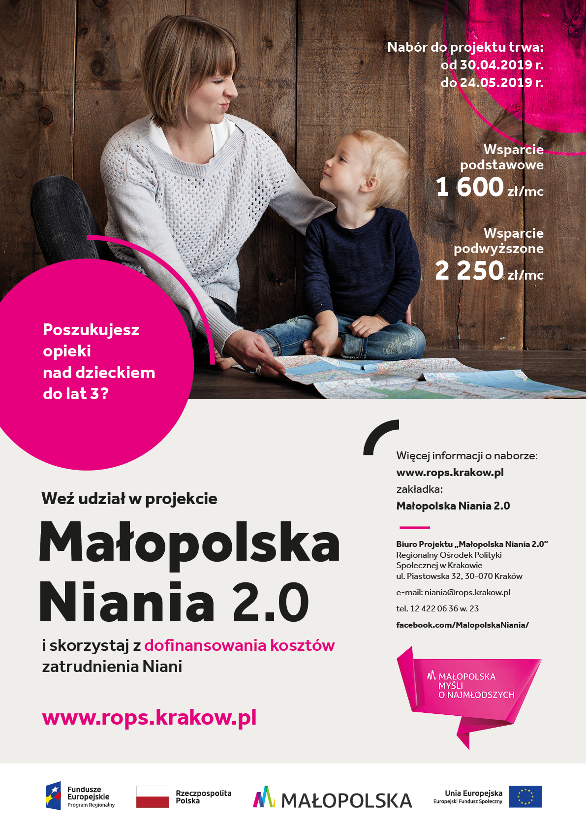 Trwa nabór do Projektu "Małopolska Niania 2.0". Zachęcamy do zapoznania się z załączoną ulotką informacyjną oraz do składania wniosków. Wszelkie informacje dostępne są na stronie organizatora: https://www.rops.krakow.pl/lewa/malopolska-niania-20-34/aktualnosci-138/ii-nabor-do-projektu-malopolska-niania-20-325.html
