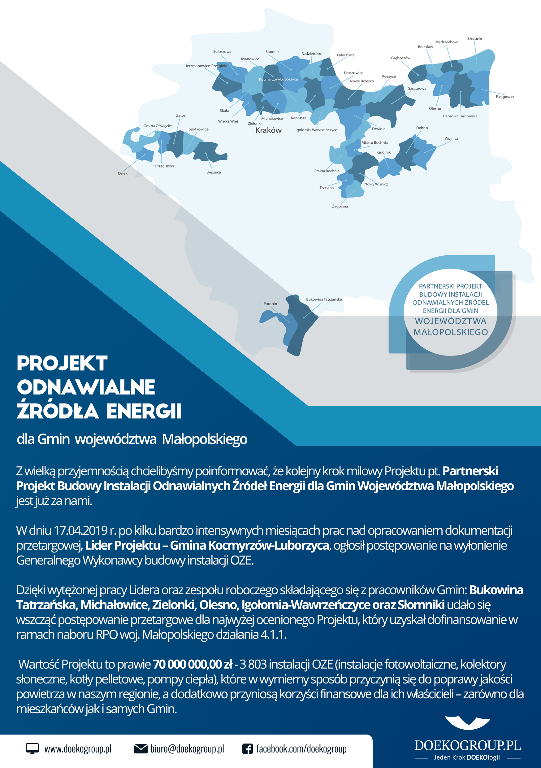 W dniu 17.04.2019 r. po kilku bardzo intensywnych miesiącach prac nad opracowaniem dokumentacji przetargowej, Lider Projektu - Gmina Kocmyrzów-Luborzyca, ogłosił postępowanie na wyłonienie Generalnego Wykonawcy budowy instalacji OZE.