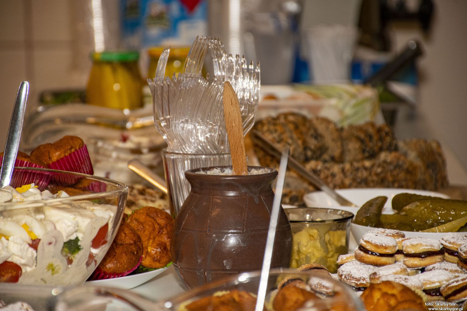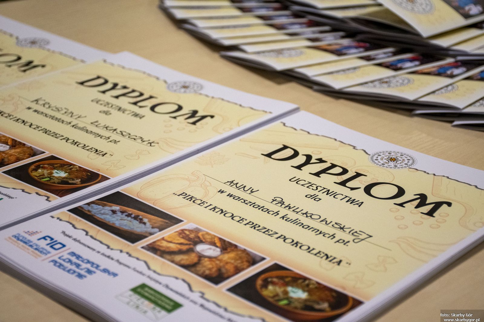 Poczęstunek na zakończenie został przygotowany przez uczestników. Wzięli oni dodatkowo udział w krótkim konkursie wiedzy o potrawach przygotowywanych na warsztatach. Do Jury zaprosiliśmy Panie z KGW w Zębie. Każdy uczestnik warsztatów otrzymał symboliczny dyplom potwierdzający udział w szkoleniu.
