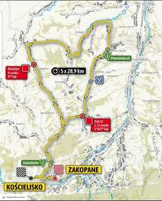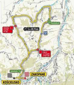 Rozpocznie 8 sierpnia się o godz. 14.15 w Zakopanem. Prowadzić będzie przez ul. Powstańców Śląskich, Nędzy Kubińca w Kościelisku, Salamandra, Butorowy Wierch – Gubałówka, Nowe Bystre, Ratułów, Ciche Dolne, Skrzypne, Bańska Niżna, Bańska Wyżna, Sierockie, Ząb, Nowe Bystre (pętla 5 x 28,9 km) na zakończenie z Nowego Bystrego kolarze pojadą w kierunku Butorowego Wierchu – Gubałówki i Salamandrą zjadą do ul. Nędzy Kubińca, którą przejadą w kierunku kościoła gdzie zlokalizowana jest meta. Zakończenie tego etapu przewidywane jest ok. godziny 18.30.