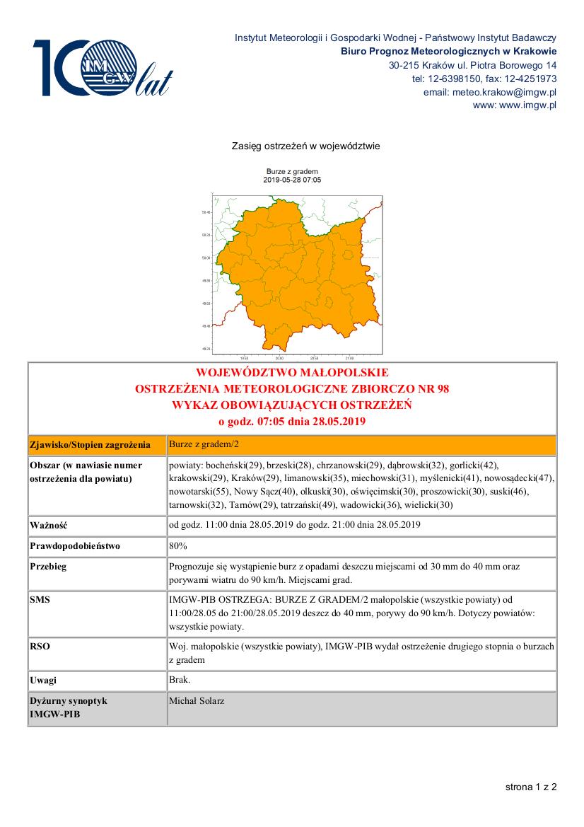 Istnieje duże prawdopodobieństwo wystąpienia burz z opadami deszczu miejscami od 30 mm do 40 mm oraz porywami wiatru do 90 km/h. Miejscami grad. Ostrzeżenie obowiązuje dziś, tj. 28.05.2019 r. w godzinach od 11:00 do 21:00.