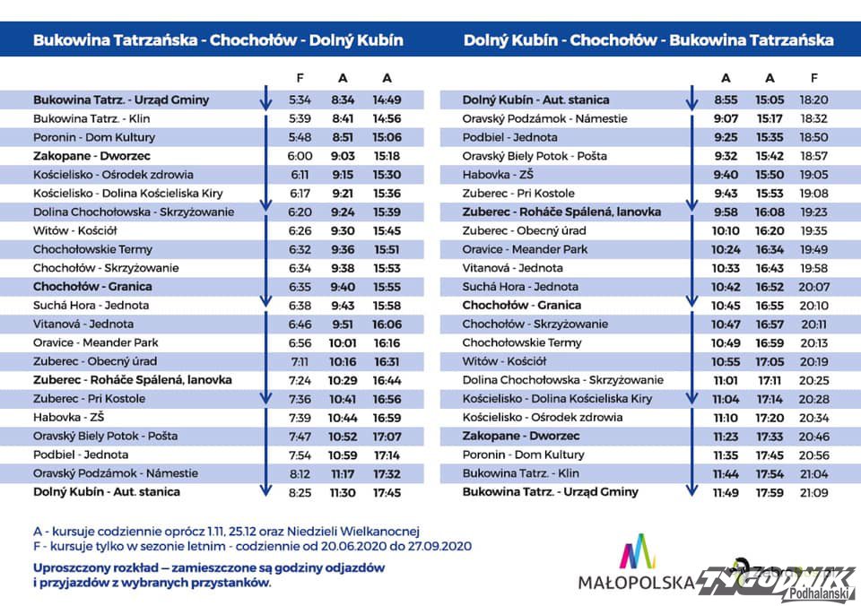 W sobotę ma ruszyć pierwszy autobus z Bukowiny przez Poronin, Zakopane, Chochołów, Orawice, Spaloną Dolinę w rejonie Zwierówki, Orawski Biały Potok do Dolnego Kubińca. W sezonie letnim autobusów będzie więcej, teraz mniej. Dzięki temu będziemy mogli zacząć wycieczkę po jednej stronie Tatr, skończyć po drugiej i wrócić autobusem!