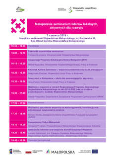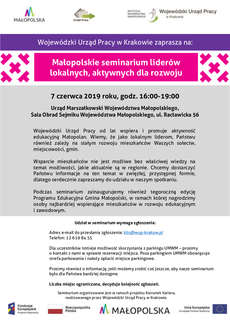 Wojewódzki Urząd Pracy w Krakowie po raz kolejny organizuje MAŁOPOLSKIE SEMINARIUM LIDERÓW LOKALNYCH AKTYWNYCH DLA ROZWOJU, które odbędzie się w dniu 7 czerwca 2019 roku w godzinach od 16:00 do 19:00 w sali obrad Sejmiku Województwa Małopolskiego w budynku Urzędu Marszałkowskiego Województwa Małopolskiego w Krakowie, przy ul. Racławickiej 56.