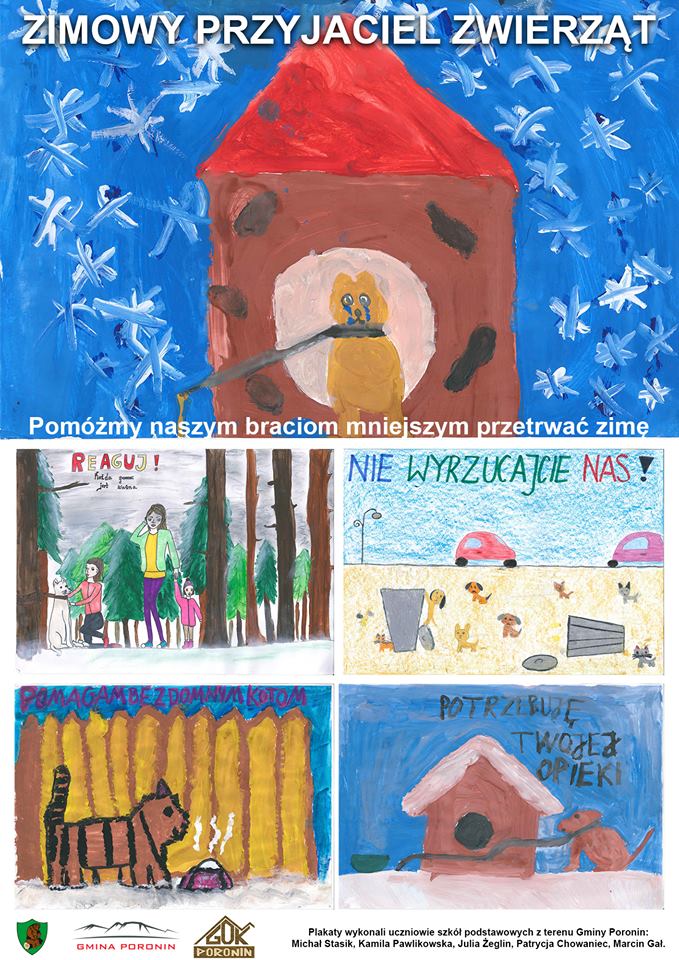 Trwa nasza akcja "Zimowy przyjaciel zwierząt" Pamiętajmy wszyscy o naszych braciach mniejszych! Początkiem zimy uczniowie ze szkół podstawowych Gminy Poronin namalowali przepiękne plakaty, przypominające nam wszystkim jak należy troszczyć się o zwierzęta zimą. Wybraliśmy kilka z tych prac i stworzyliśmy jeden plakat. Dziękujemy sołtysom za rozwieszenie go początkiem roku w sołectwach gminy. Jeżeli ktoś chciałby włączyć się do naszej akcji i rozwiesić choć kilka plakatów - zapraszamy do kontaktu z nami!