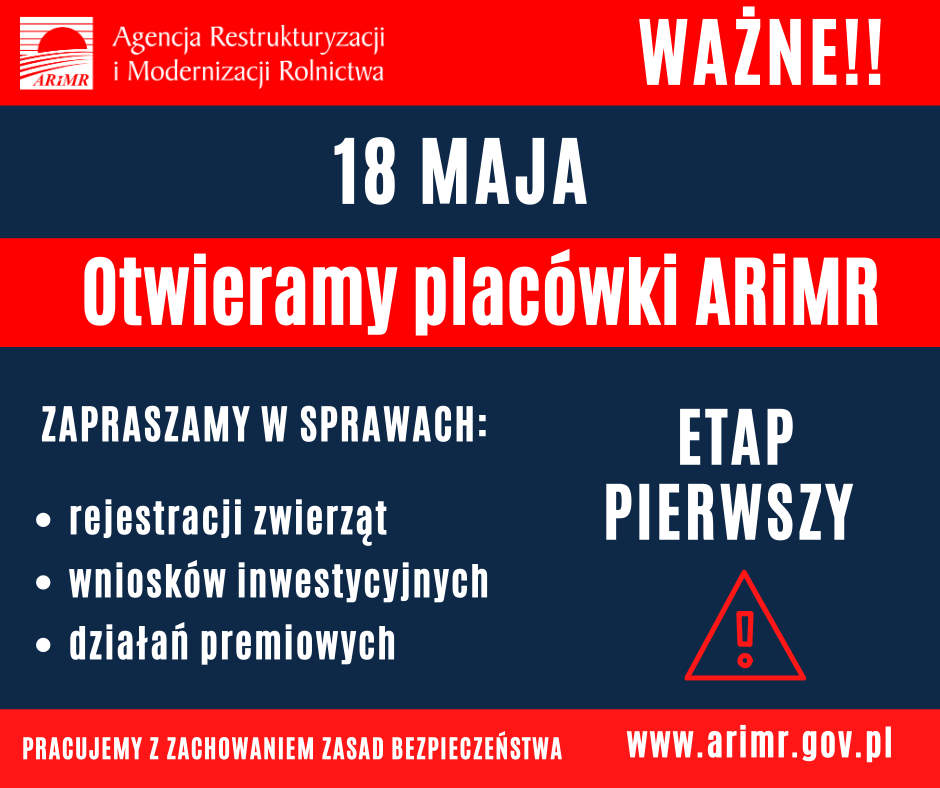W związku z wprowadzeniem w Polsce stanu epidemii, od 16 marca 2020 r. ograniczona została możliwość bezpośredniego kontaktu z klientem w biurach powiatowych, oddziałach regionalnych i centrali ARiMR. Mimo wprowadzenia obostrzeń Agencja realizuje swoje zadania na bieżąco.
