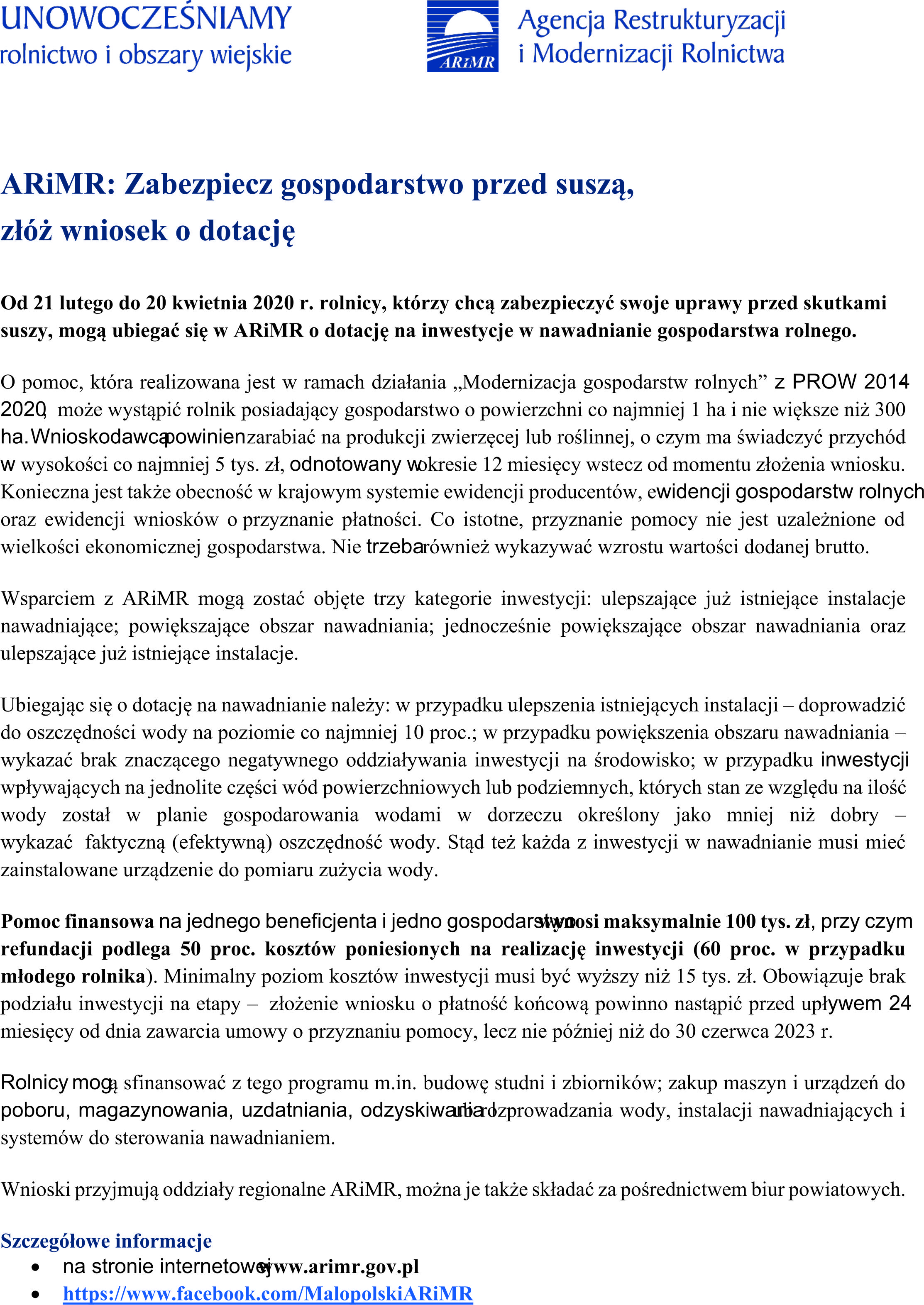 ARiMR: Zabezpiecz gospodarstwo przed suszą, złóż wniosek o dotację
