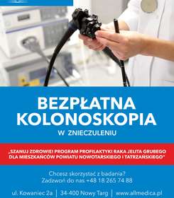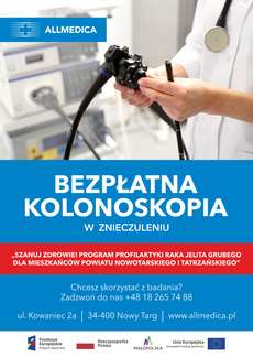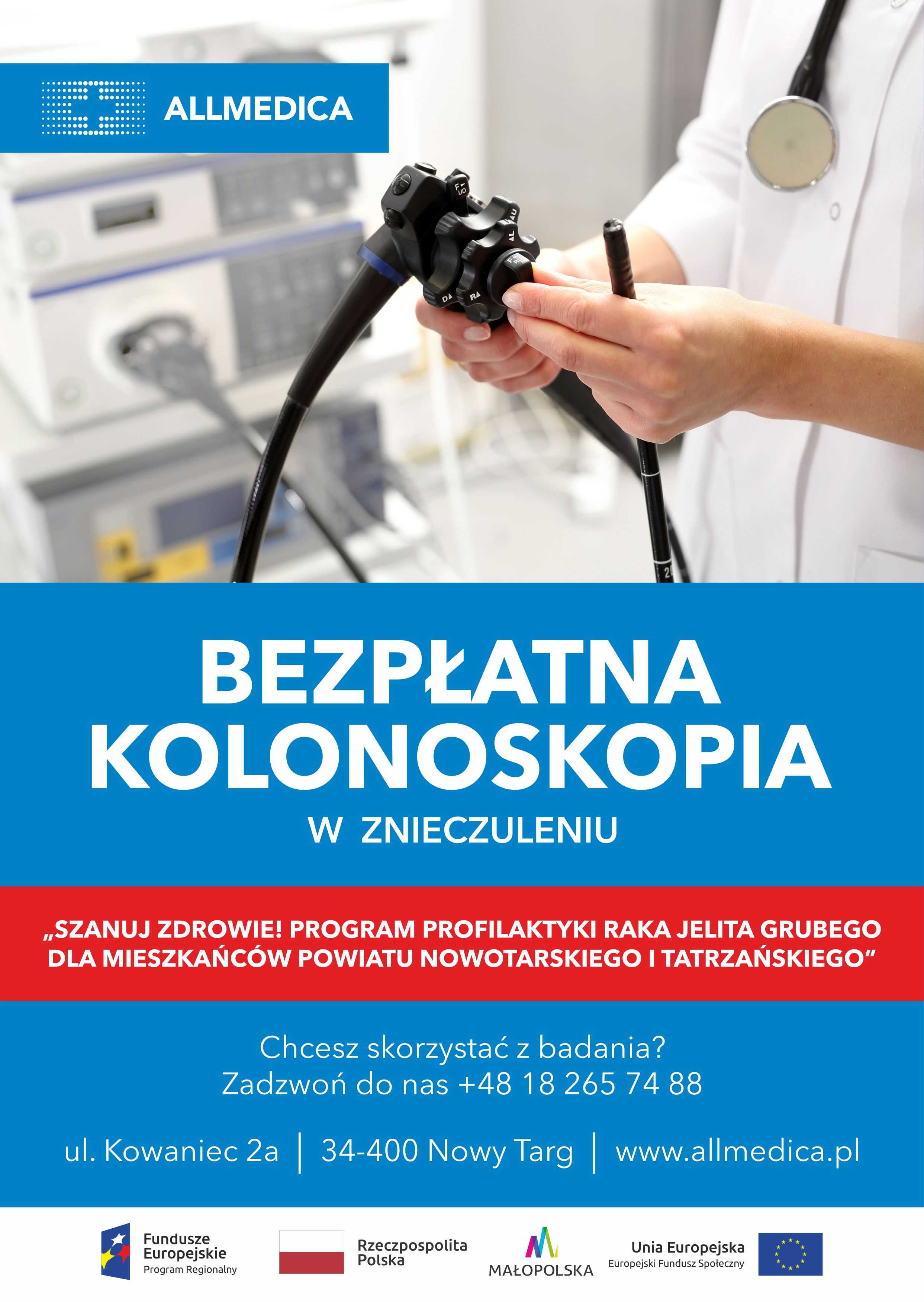 Od maja 2019 r. w Allmedica w Nowy Targu z dużym sukcesem w ramach programu „Szanuj zdrowie! Program profilaktyki raka jelita grubego dla mieszkańców powiatu nowotarskiego i tatrzańskiego” wykonujemy badania przesiewowe w kierunku raka jelita grubego. Do tej pory wykonaliśmy ponad 700 badań kolonoskopowych w ramach wspomnianego projektu. Badania są w pełni bezpłatne i w trosce o komfort pacjenta wykonujemy je w pełnym znieczuleniu, przy asyście lekarza anestezjologa. Koszt badania pokrywa Unia Europejska i Skarb Państwa.