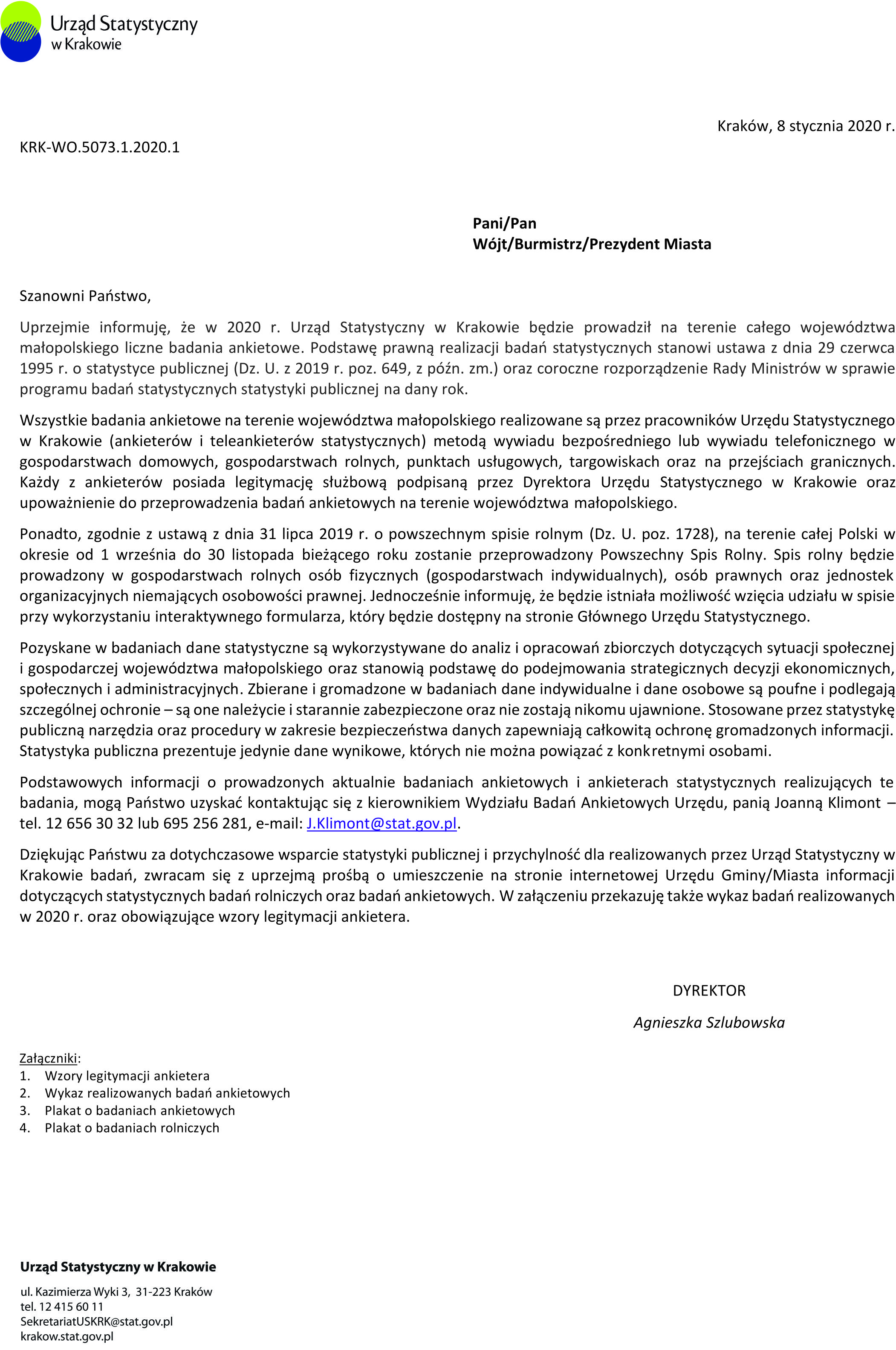 Informacja Urzędu Statystycznego w Krakowie w sprawie prowadzenia na terenie całego województwa małopolskiego badań ankietowych