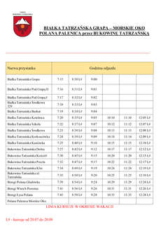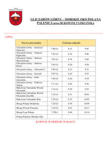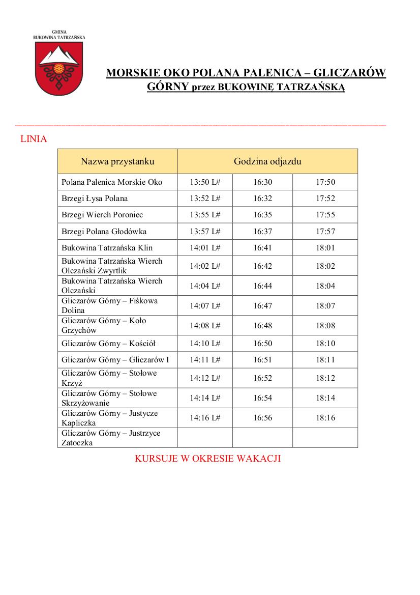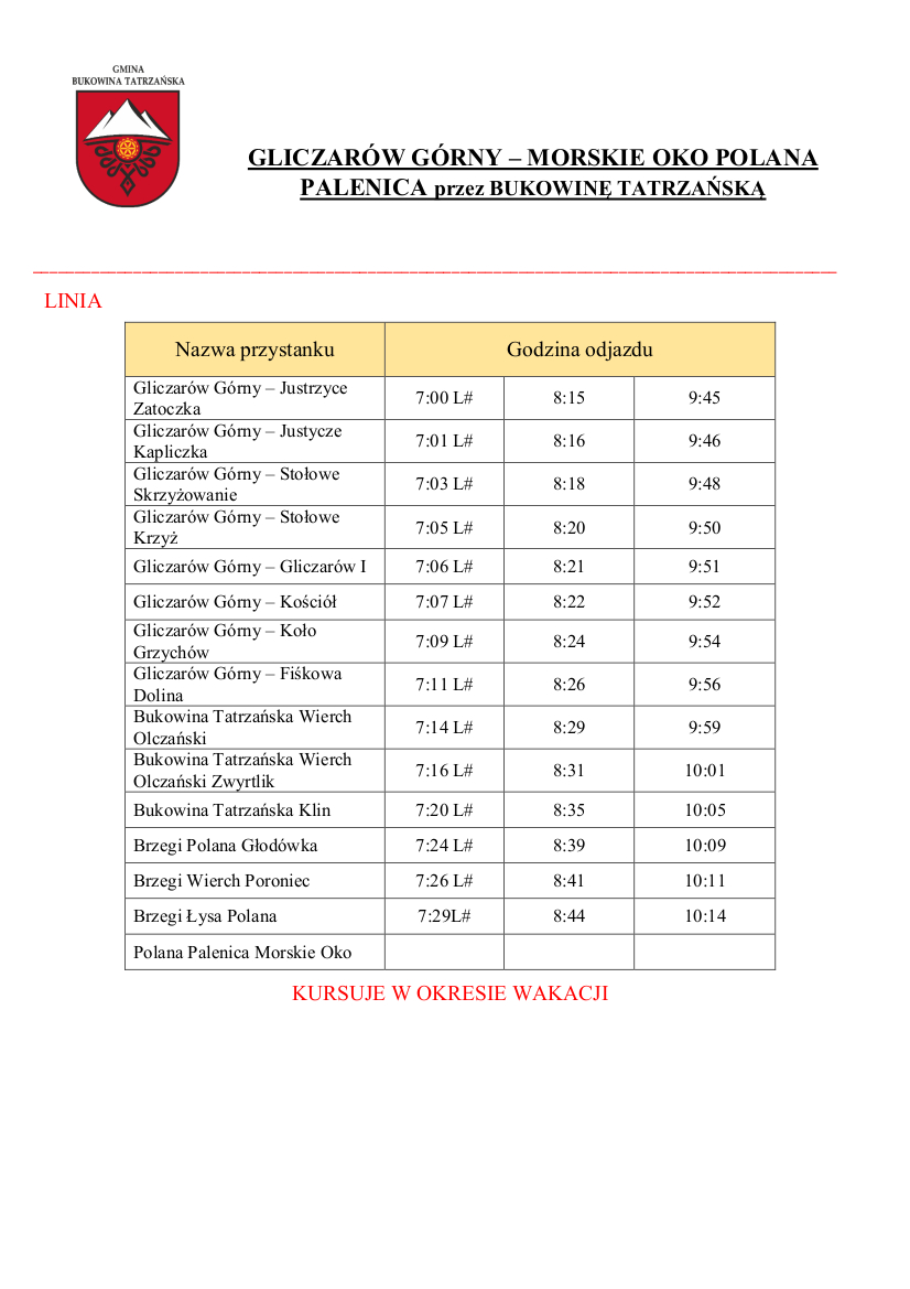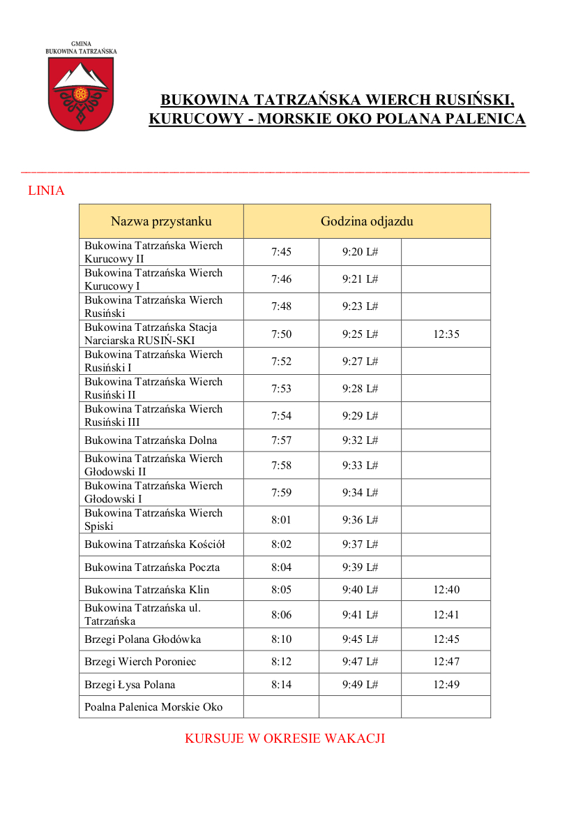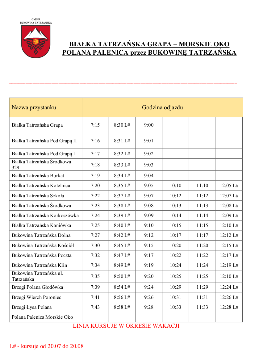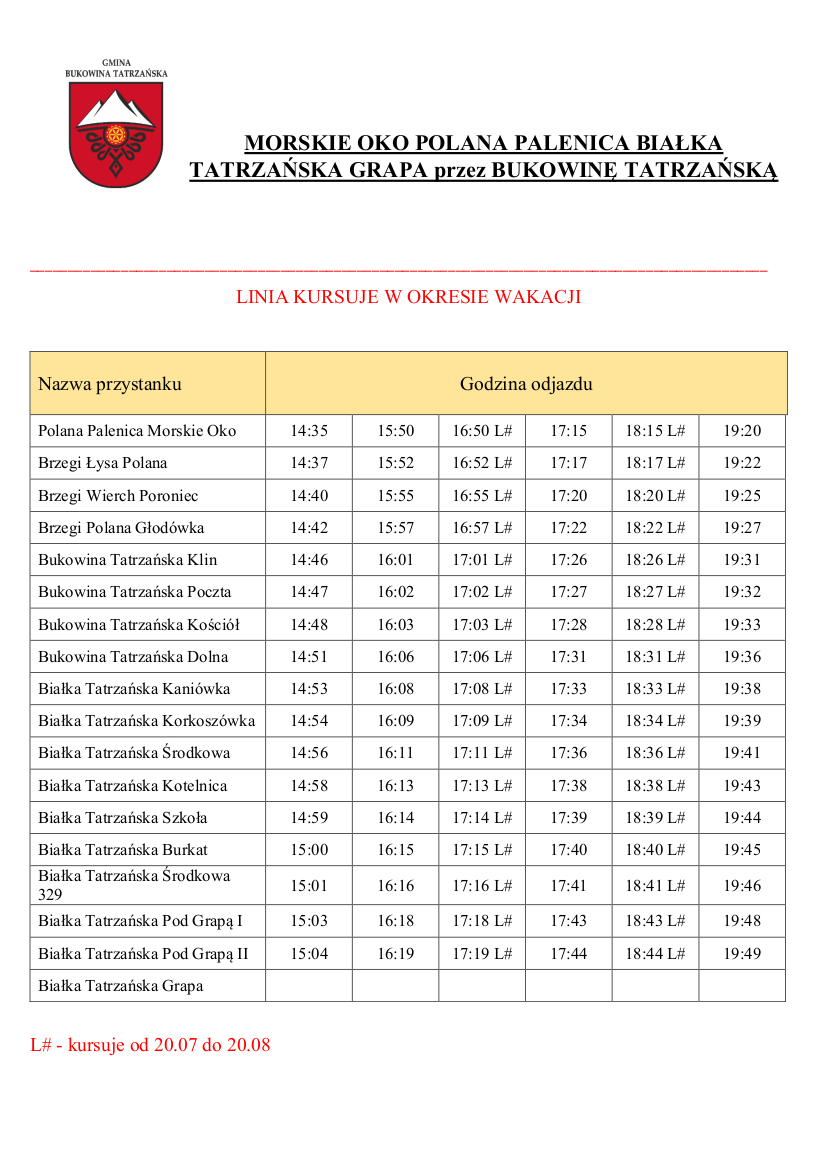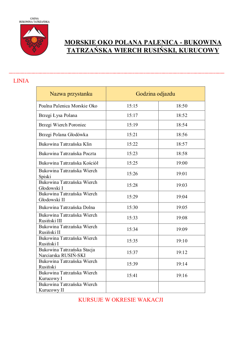 Wójt Gminy Bukowina Tatrzańska przypomina, że w tym roku została zmieniona organizacja ruchu w tym rejonie i auto może zostać odholowane. Jednocześnie chcąc zapewnić każdemu turyście możliwość odwiedzenia Morskiego Oka bez narażania się na stanie w wielokilometrowym korku czy mandat Wójt Gminy Bukowina Tatrzańska, z dniem 1 lipca 2020 roku Gmina Bukowina Tatrzańska uruchomiła następujące linie użyteczności publicznej: