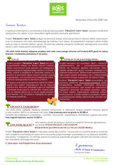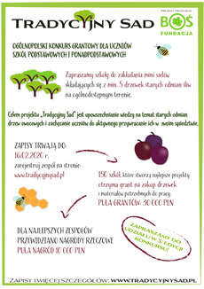 "TRADYCYJNY SAD" to ogólnopolski projekt edukacyjny organizowany jest przez Fundację Banku Ochrony Środowiska z myślą o zachowaniu różnorodności biologicznej Polski i zdrowiu społeczeństwa.