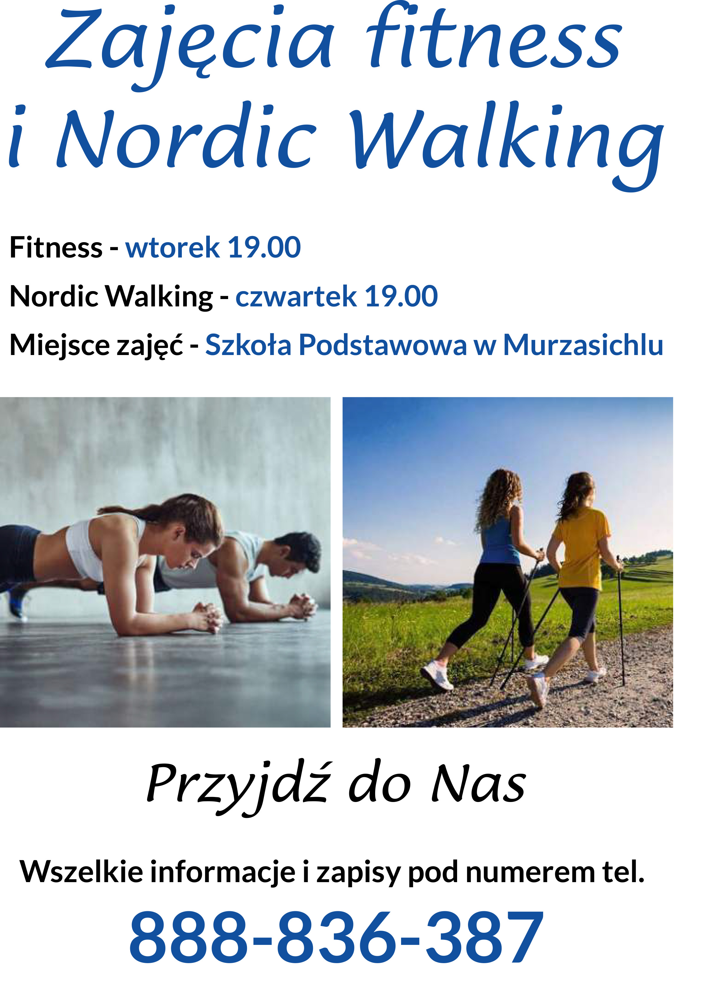 Rozpoczynają się zapisy na zajęcia z fitness i nordic walking. Zajęcia będą się odbywać w Szkole Podstawowej w Murzasichlu we wtorki i czwartki. Zainteresowanych prosimy o kontakt pod nr telefonu 888-836-387