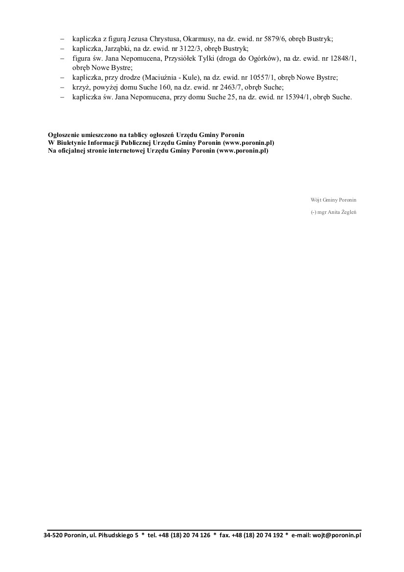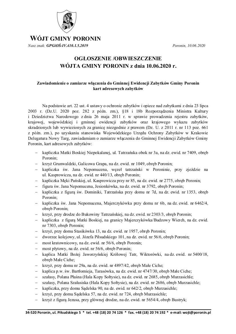 Zawiadomienie o zamiarze włączenia do Gminnej Ewidencji Zabytków Gminy Poronin kart adresowych zabytków
