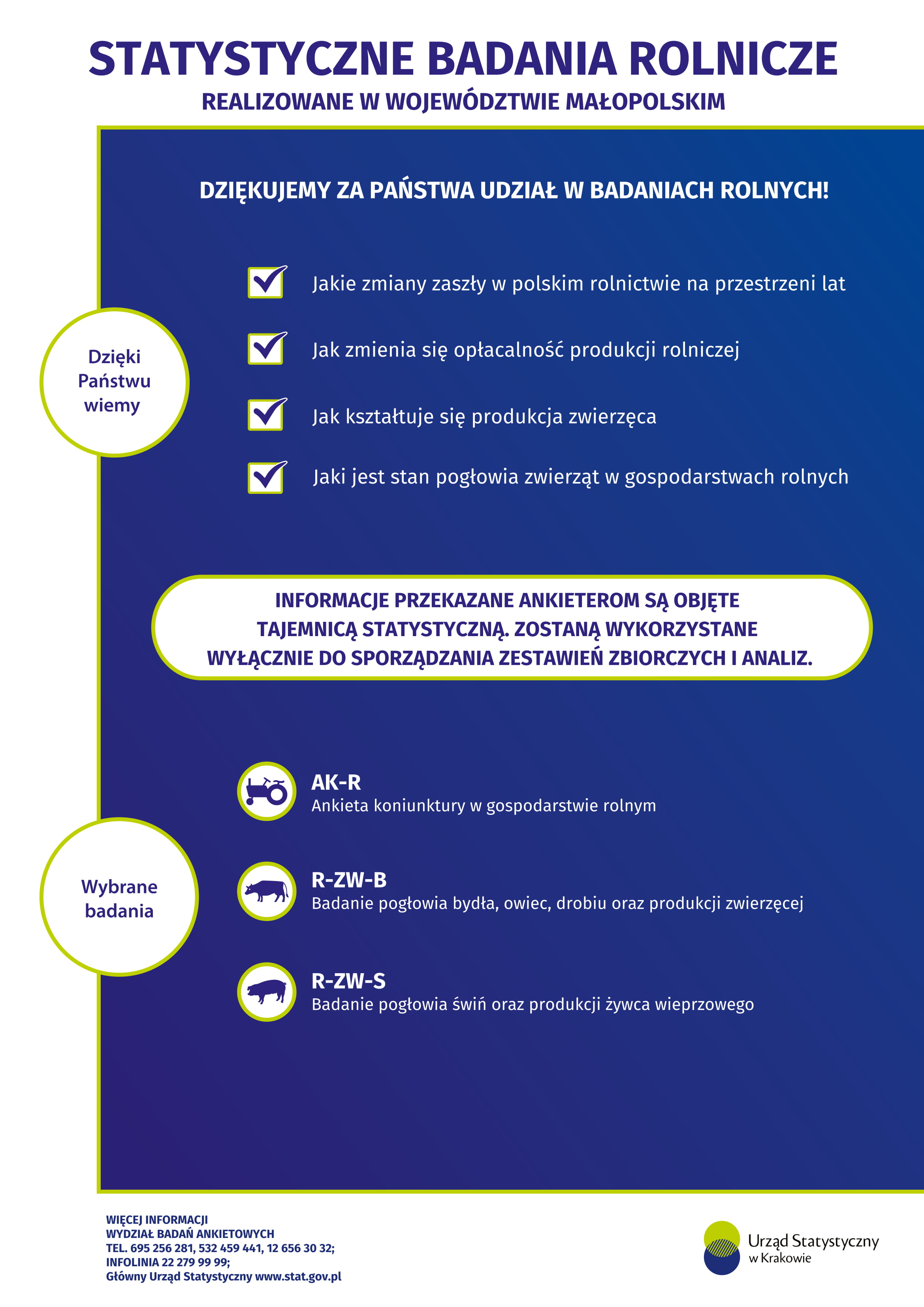 Pozyskane w badaniach statystycznych dane są wykorzystywane do analiz i opracowań zbiorczych dotyczących sytuacji społecznej i gospodarczej województwa małopolskiego oraz stanowią podstawę do podejmowania strategicznych decyzji ekonomicznych, społecznych i administracyjnych. Zbierane i gromadzone w badaniach dane indywidualne i osobowe są objęte tajemnicą statystyczną – są one należycie i starannie zabezpieczone oraz nie zostają nikomu ujawnione. Stosowane przez statystykę publiczną narzędzia oraz procedury w zakresie bezpieczeństwa danych zapewniają całkowitą ochronę gromadzonych informacji. Statystyka publiczna prezentuje jedynie dane wynikowe, których nie można powiązać z konkretnymi osobami.