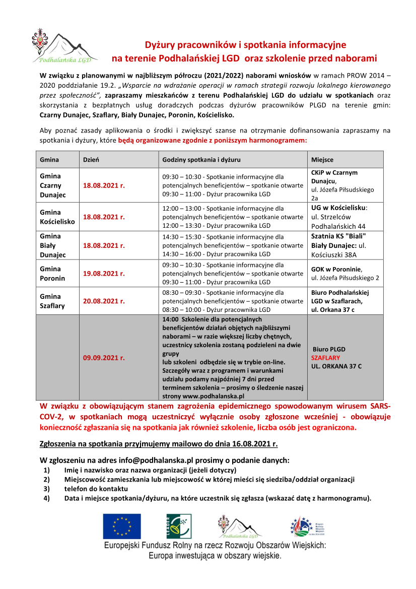 Podhalańska LGD - harmonogram dyżurów w gminach i spotkań