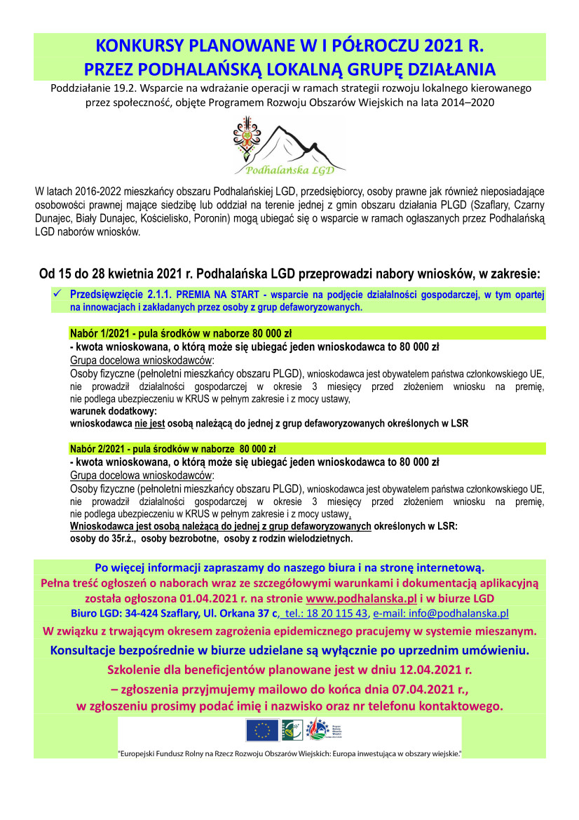 Informacja o planowanych naborach wniosków w Podhalańskiej LGD