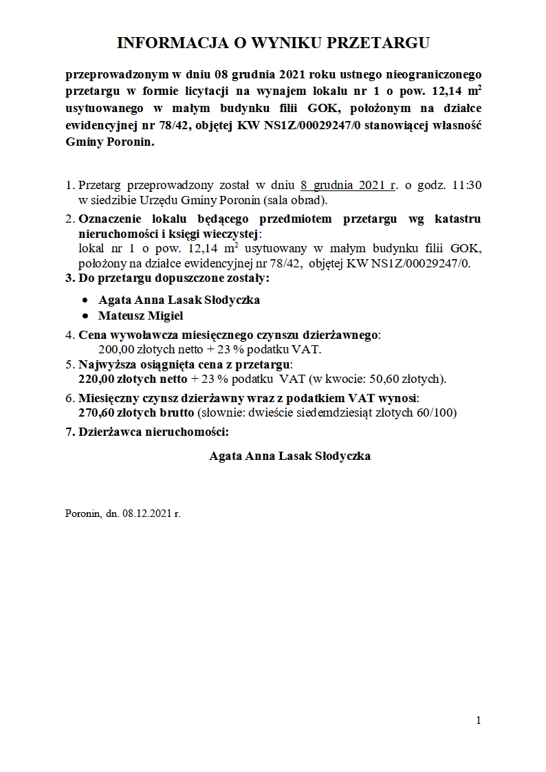 Poniżej przedstawiono informacje o wynikach przetargu w dniu 08.12.2021 r. na dzierżawę części działki nr 596/13 oraz wynajem lokali nr 1 oraz nr 2 na terenie działki nr 78/42.