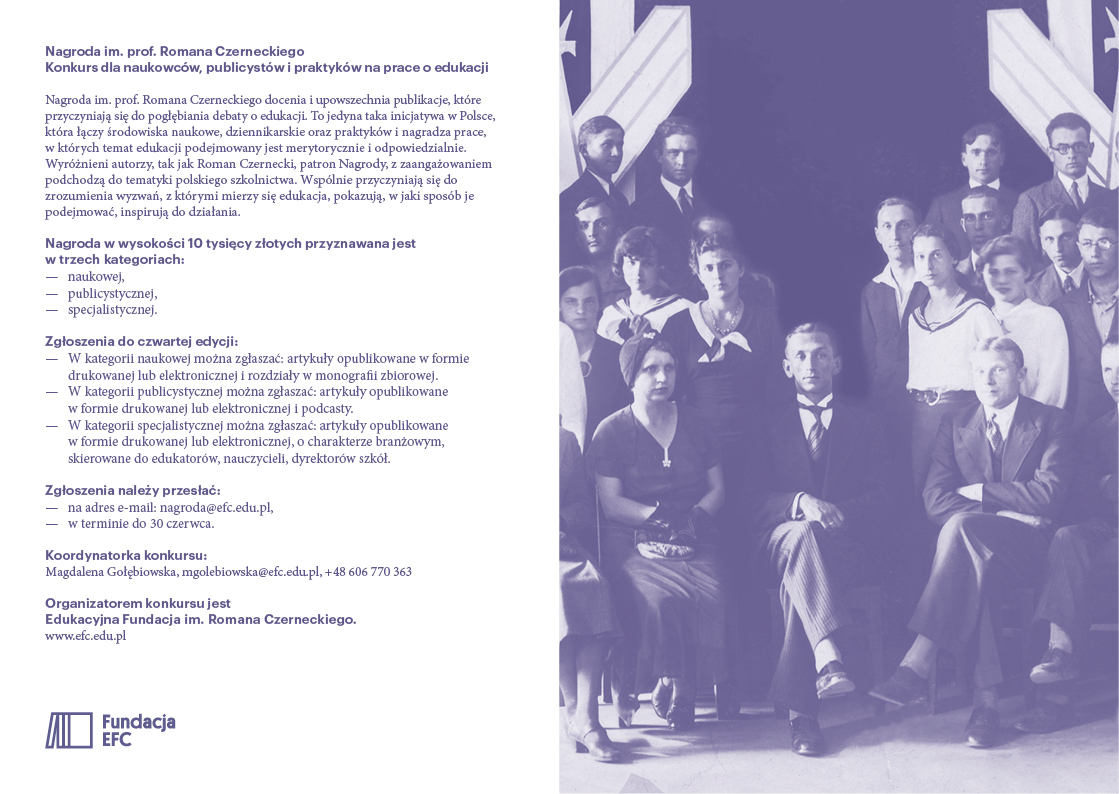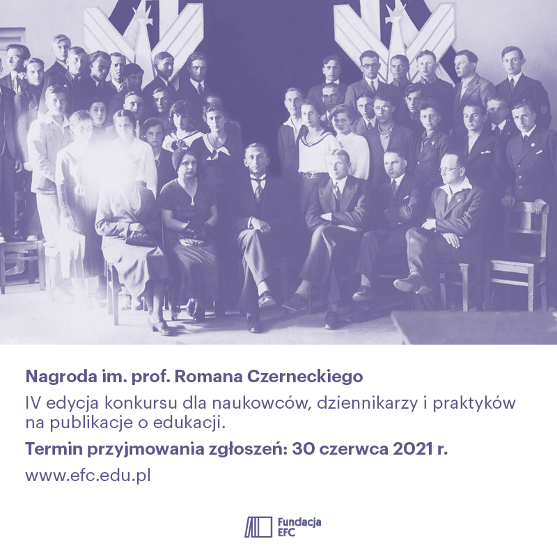 Fundacja EFC przyjmuje zgłoszenia do IV edycji Nagrody im. prof. Romana Czerneckiego. Nagroda przyznawana jest naukowcom, dziennikarzom i praktykom za publikacje o edukacji. Celem konkursu jest docenienie i upowszechnienie wartościowych prac, które odpowiadają na aktualne wyzwania, przed którymi stoi polski system edukacji. Nagroda w wysokości 10 tysięcy złotych przyznawana jest w trzech kategoriach: naukowej, publicystycznej i specjalistycznej. Do 30 czerwca można zgłaszać swoje prace do konkursu.