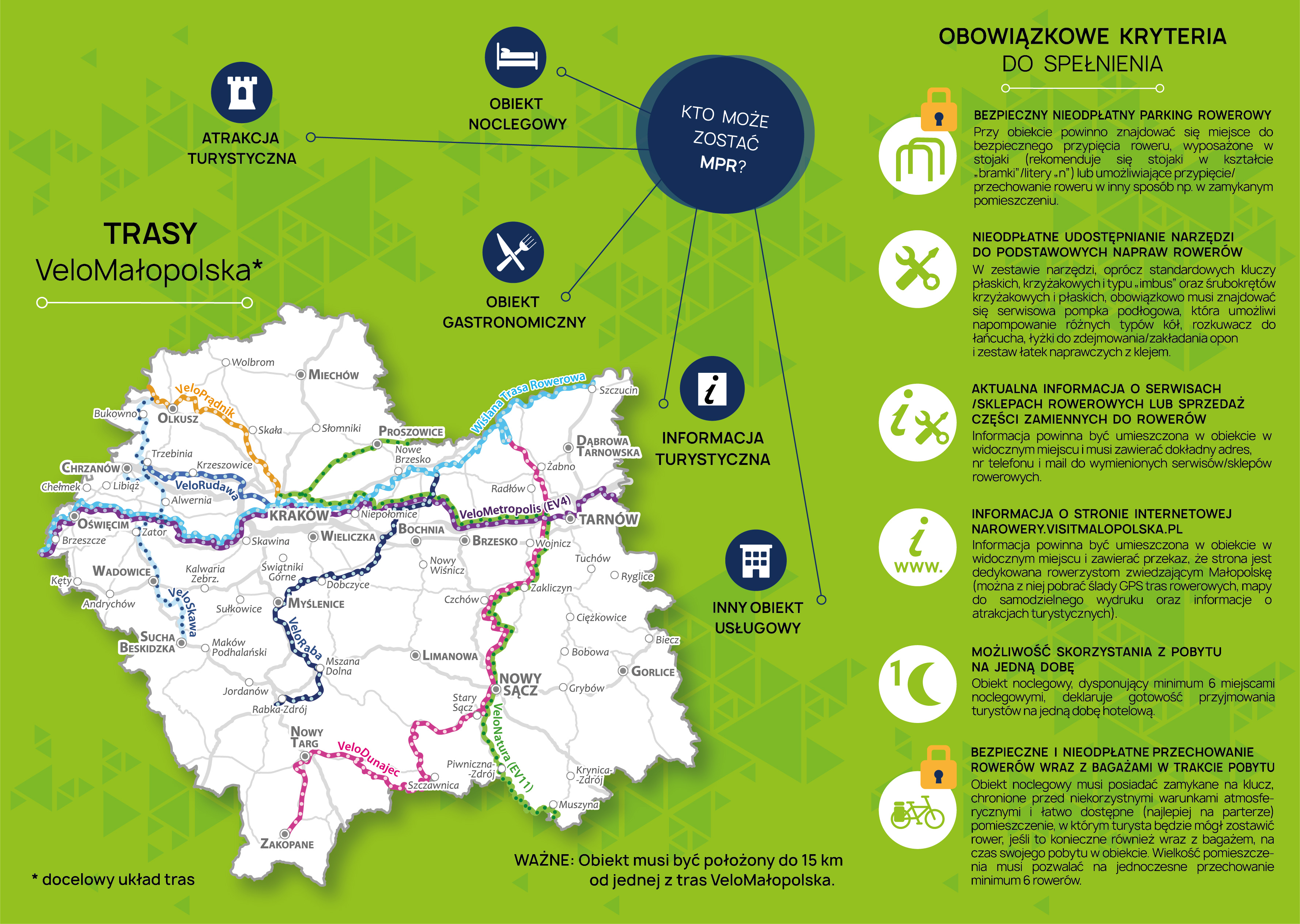 zlokalizowane (prowadzące działalność) w województwie małopolskim, w odległości nie większej niż 15 km od jednej z tras rowerowych sieci VeloMałopolska do zgłoszenia udziału w otwartym i nieodpłatnym Systemie Rekomendacji Miejsc Przyjaznych Rowerzystom w województwie małopolskim.