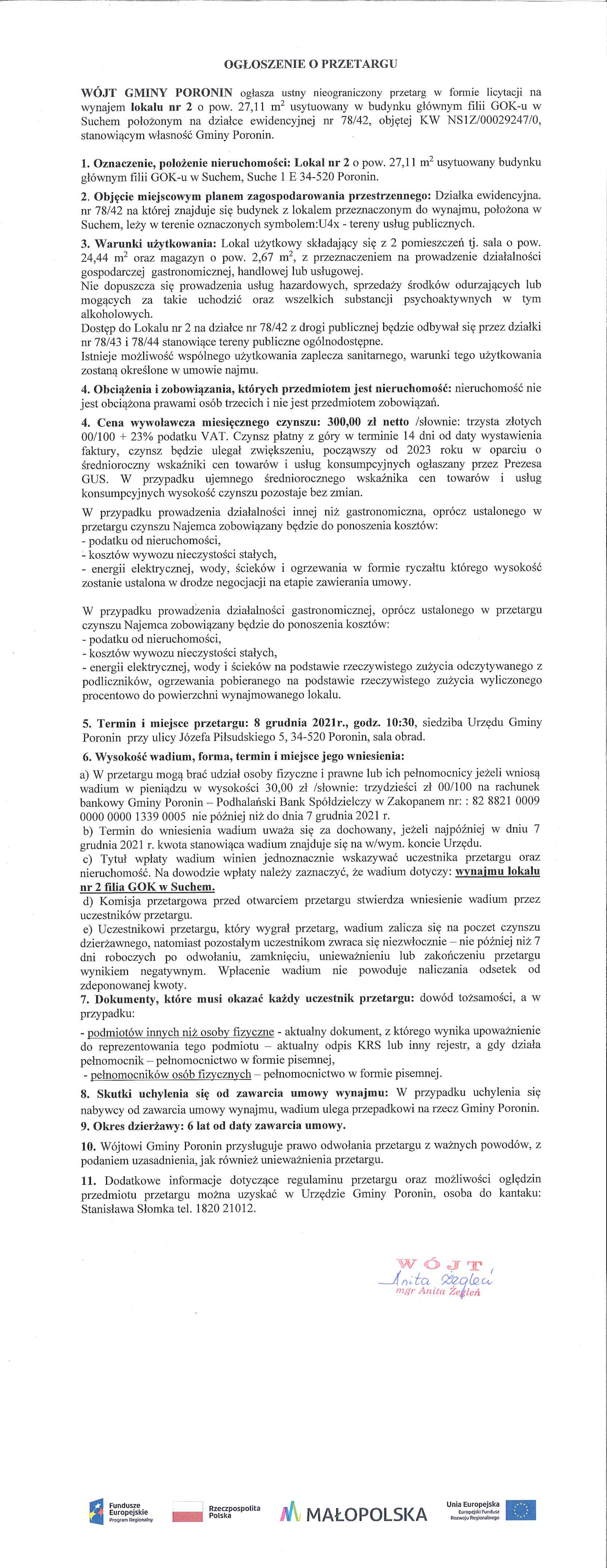 Ogłoszenie o przetargu na wynajem lokalu nr 2 w filli GOK w Suchem