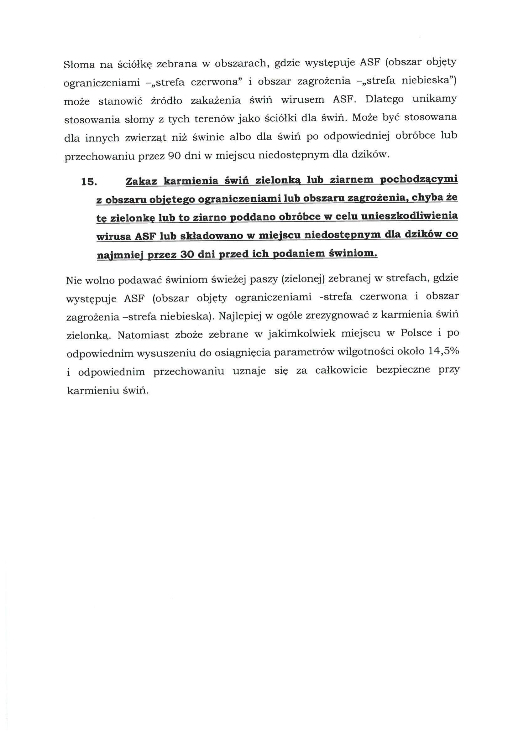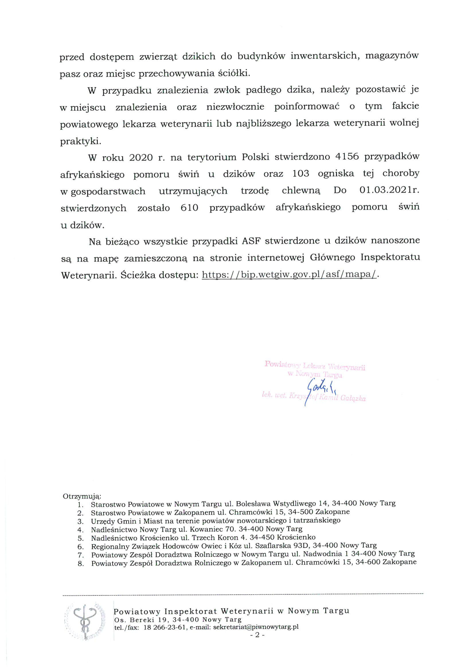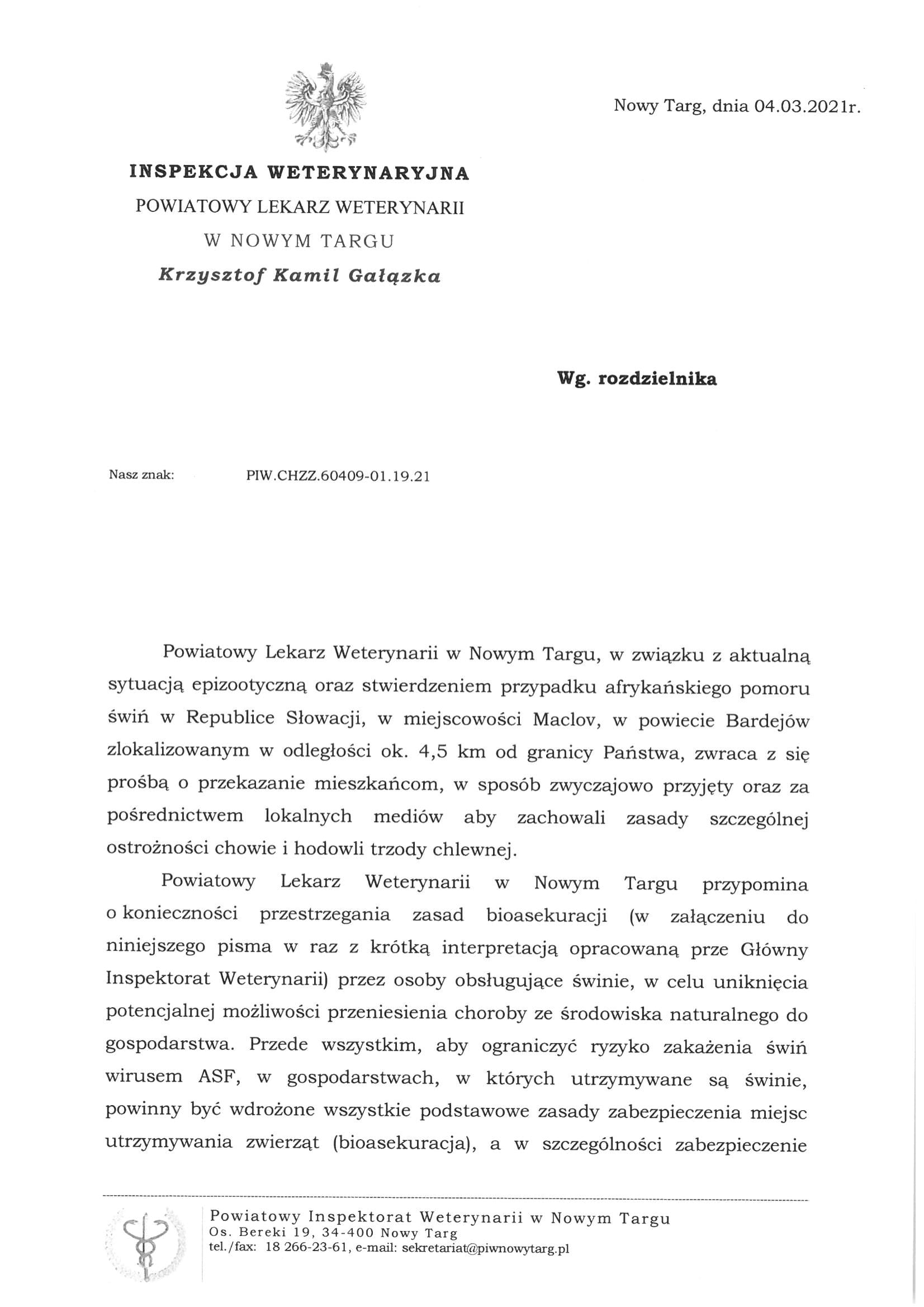 Pismo Powiatowego Lekarza Weterynarii w Nowym Targu w związku z aktualną sytuacją epizootyczną