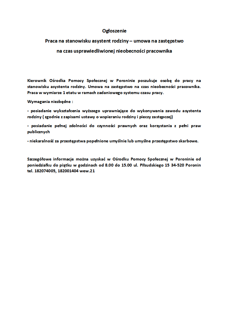 Praca - Ośrodek Pomocy Społecznej w Poroninie