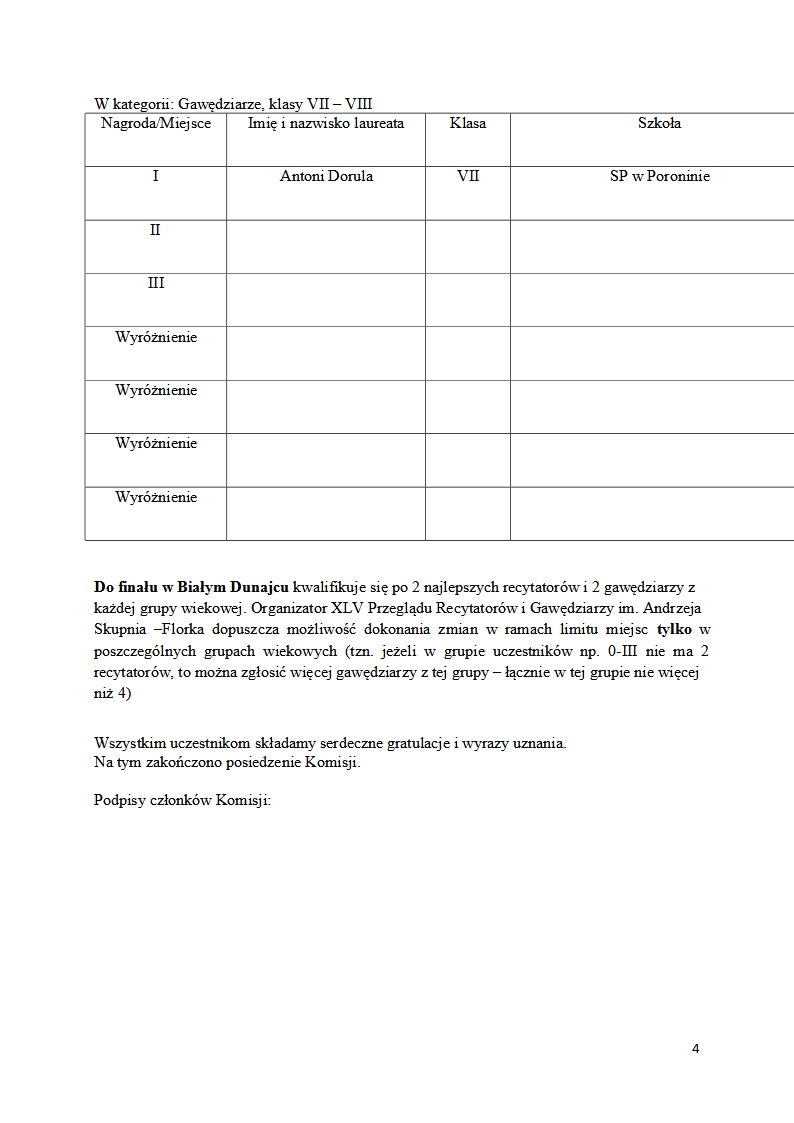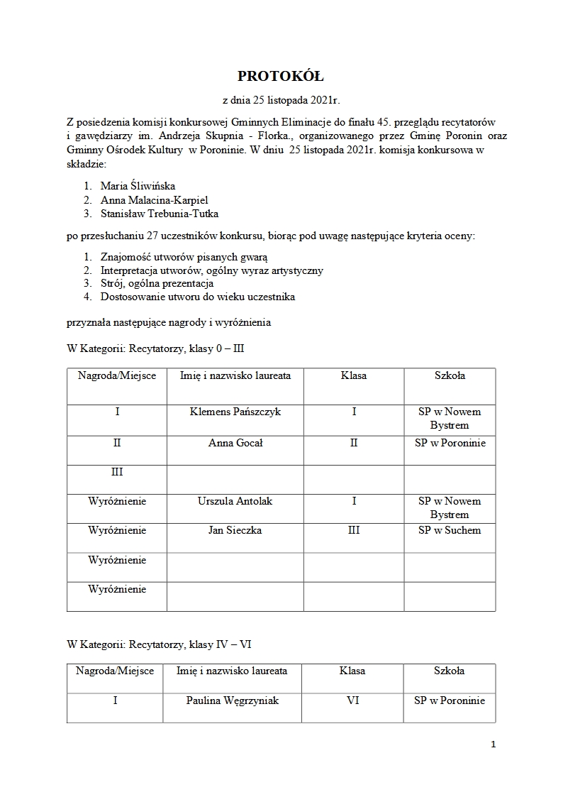 Poniżej przedstawiamy protokół z Przeglądu Recytatorów i Gawędziarzy im. Andrzeja Skupnia - Florka w Poroninie.