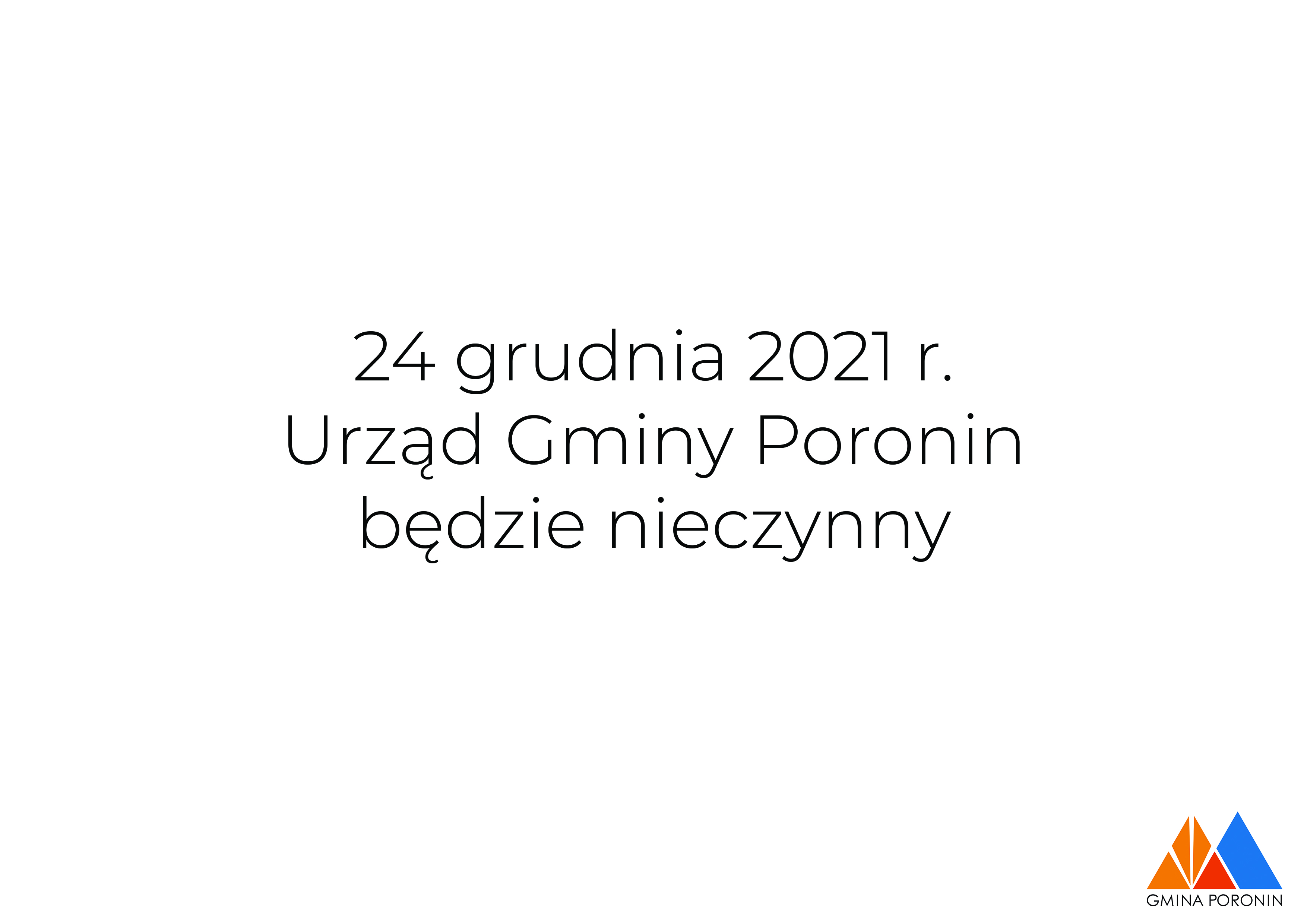 Informujemy, że w dniu 24 grudnia 2021 r. Urząd Gminy Poronin będzie nieczynny.