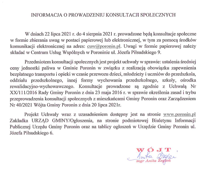 Ustalenie średniej ceny jednostki paliwa w Gminie Poronin - konsultacje