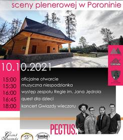 Wielkie otwarcie parku oraz nowej sceny plenerowej w Poroninie odbędzie się 10 października 2021 r. Planowane są występy gwiazd, zespołów oraz wiele wiele innych atrakcji i niespodzianek. Zapraszamy na teren Gminnego Ośrodka Kultury w Poroninie.