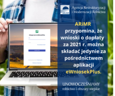 ARiMR przypomina, że wnioski o dopłaty bezpośrednie i obszarowe za 2021 r. można składać jedynie za pośrednictwem aplikacji eWniosekPlus. W tym roku Agencja nie wysyła oświadczeń o braku zmian. Rolnicy, którzy w 2020 r. składali oświadczenia czy też wnioski dotyczące dopłat bezpośrednich w formie papierowej, w tym roku muszą złożyć wnioski w formie elektronicznej korzystając z aplikacji eWniosekPlus. Termin upływa 17 czerwca 2021 r.
