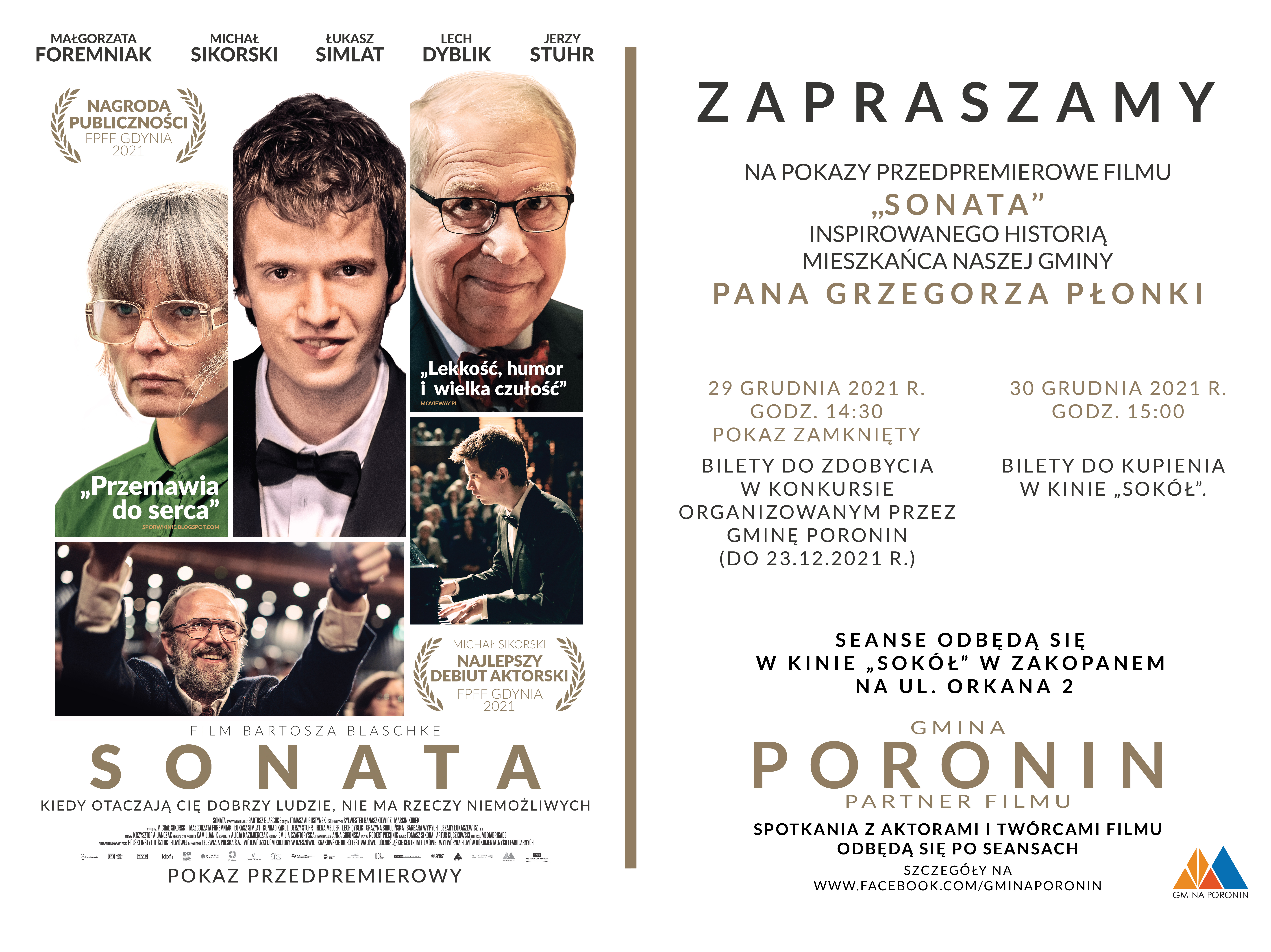 Serdecznie zapraszamy na premierę filmu Bartosza Blaschke „SONATA” inspirowanego historią mieszkańca naszej gminy pana Grzegorza Płonki.