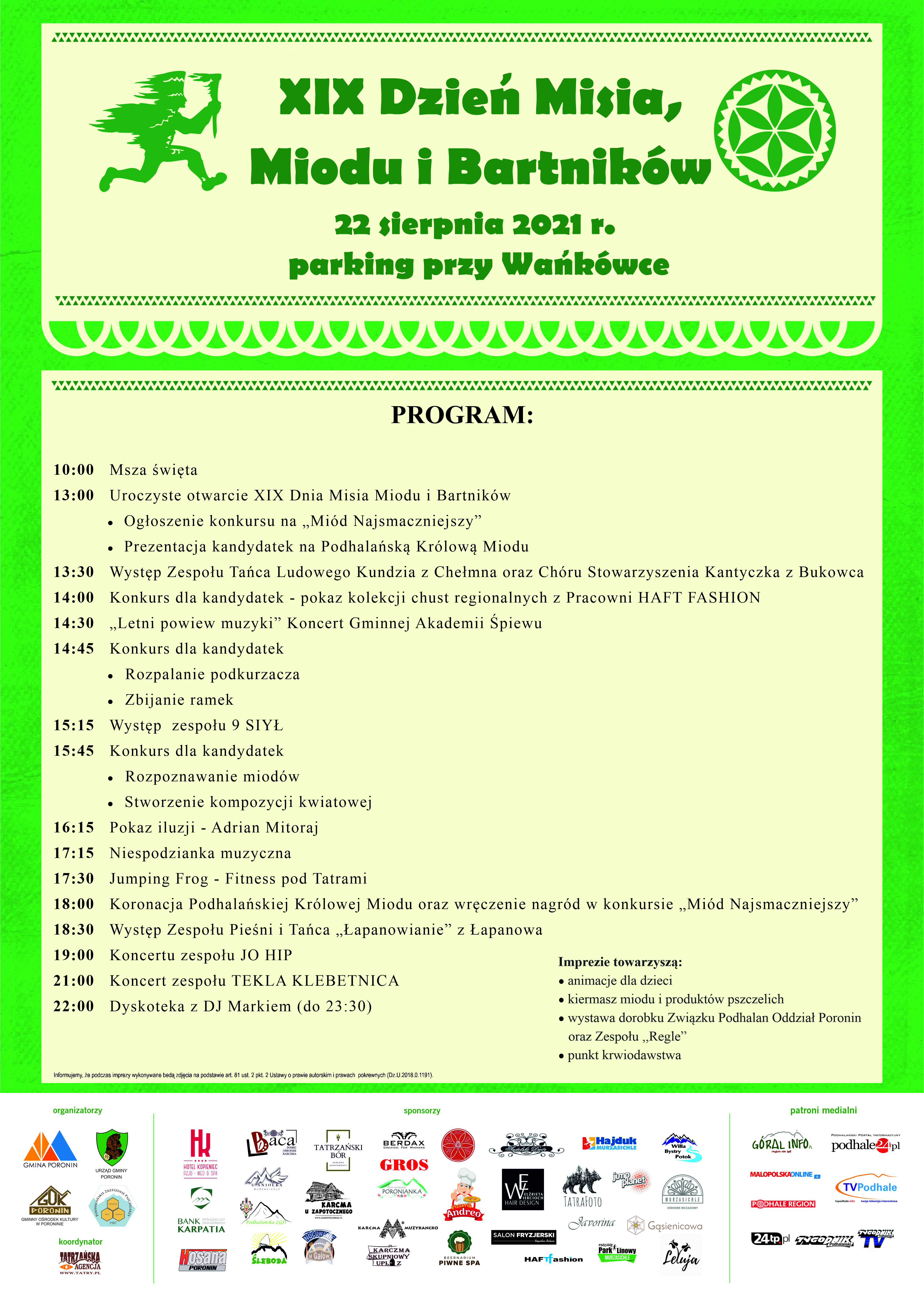 18:00 Koronacja Podhalańskiej Królowej Miodu oraz wręczenie nagród w konkursie „Miód Najsmaczniejszy”