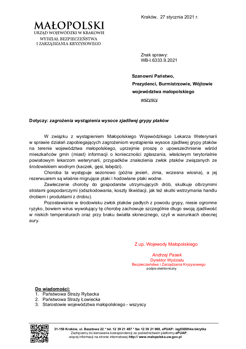 Zagrożenie wystąpienia wysoce zjadliwej grypy ptaków