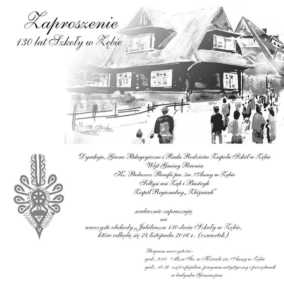 Uroczyste obchody Jubileuszu 130 - lecia Szkoły w Zębie, odbędą się 24 listopada 2016 r.