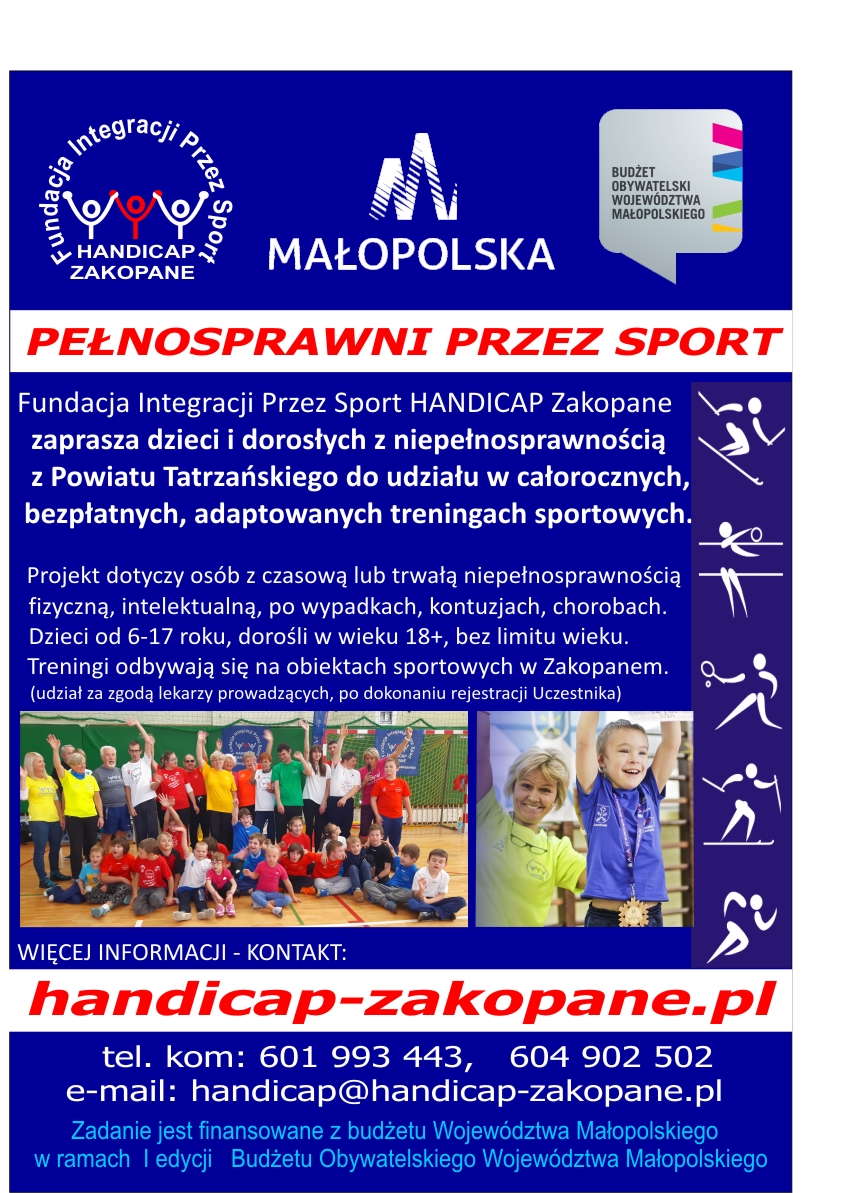 Projekt PEŁNOSPRAWNI PRZEZ SPORT został wybrany przez mieszkańców Powiatu Tatrzańskiego w głosowaniu I edycji Budżetu Obywatelskiego Małopolski. Zadanie polega na prowadzeniu całorocznych, regularnych treningów sportowych dla osób z niepełnosprawnością oraz na włączaniu uczestników do rywalizacji sportowej otwartej, integracyjnej lub adaptowanej.