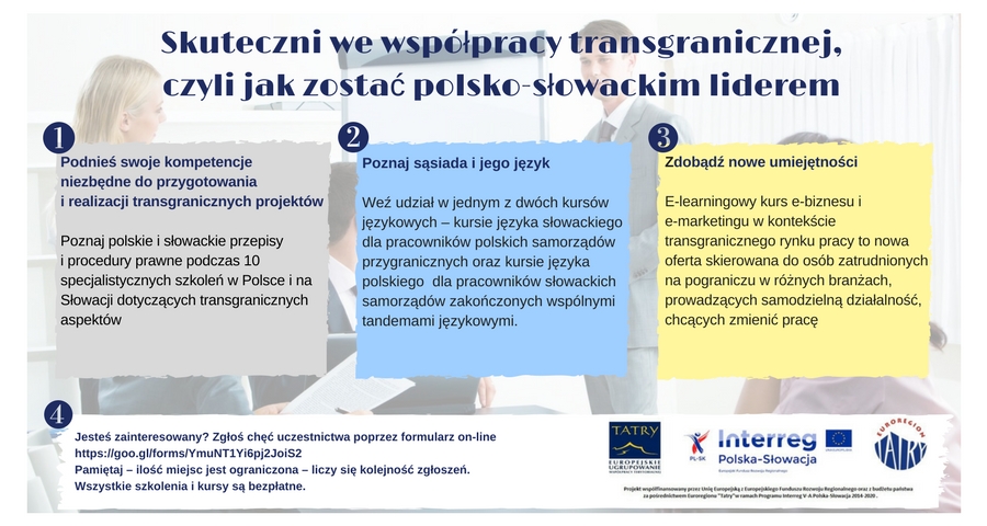 Europejskie Ugrupowanie Współpracy Terytorialnej TATRY rozpoczęło nabór na szkolenia i kursy organizowane w ramach mikroprojektu pt. “Transgraniczne doskonalenie zawodowe i specjalistyczne w EUWT TATRY”, współfinansowanego przez Unię Europejską z Europejskiego Funduszu Rozwoju Regionalnego oraz z budżetu państwa za pośrednictwem Euroregionu “Tatry” w Programie Interreg V-A Polska-Słowacja 2014-2020.