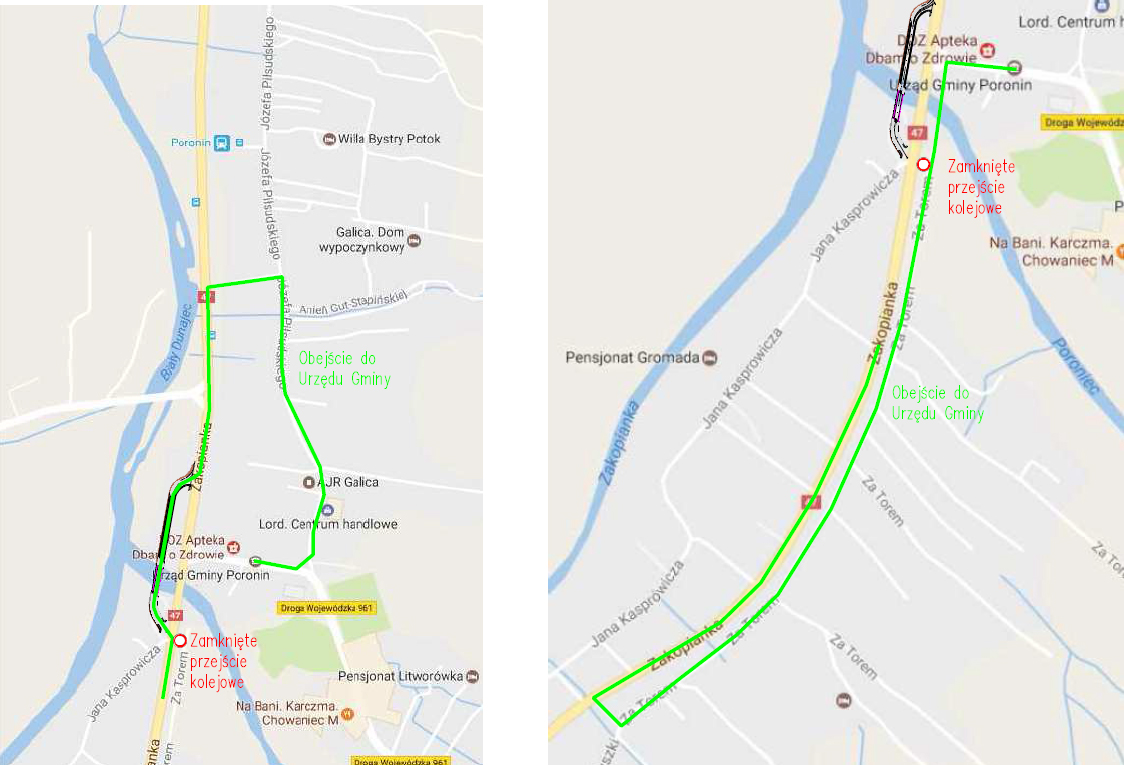 W dniu 2 czerwca 2017 r. zostaną ukończone prace związane z wykonaniem i dopuszczeniem do użytkowania wiaduktu kolejowego WK-03, zostanie przywrócony ruch kolejowy do stacji Zakopane. W tym samym dniu zostanie zamknięte przejście kolejowe przy ulicy Kasprowicza. Na załączonej mapce pokazana jest trasa przejścia pieszego do urzędu gminy po zamknięciu w/w przejścia kolejowego. Prosimy o zapoznanie się i przestrzeganie pokazanych tras.