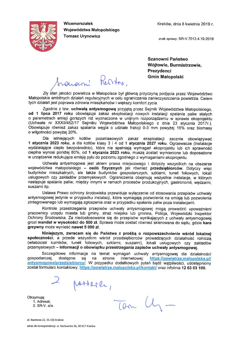 Zgodnie z tzw. uchwałą antysmogową przyjętą przez Sejmik Województwa Małopolskiego, od 1 lipca 2017 roku obowiązuje zakaz eksploatacji nowych instalacji spalania paliw stałych o parametrach emisji gorszych niż wyznaczone w unijnym rozporządzeniu w sprawie ekoprojektu (Uchwała nr XXXII/452/17 Sejmiku Województwa Małopolskiego z dnia 23 stycznia 2017r.). Obowiązuje również zakaz spalania węgla o udziale frakcji 0-3 mm powyżej 15% oraz biomasy