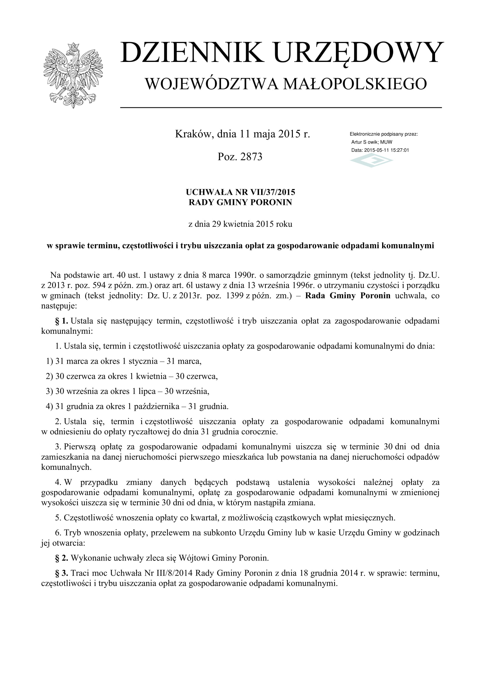 UCHWAŁA NR VII/37/2015 RADY GMINY PORONIN z dnia 29 kwietnia 2015 r.