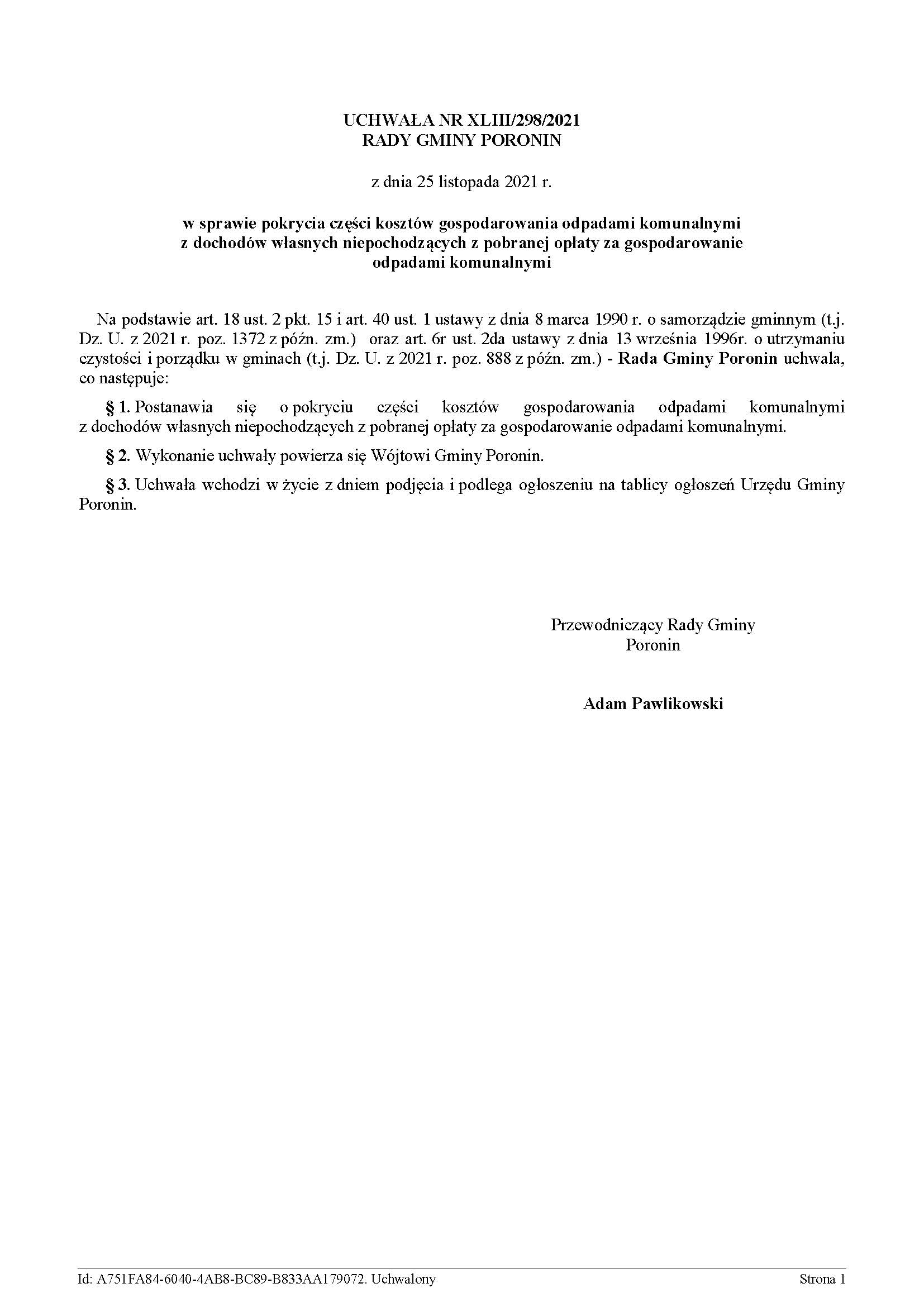 UCHWAŁA NR XLIII/298/2021 RADY GMINY PORONIN z dnia 25 listopada 2021 r.