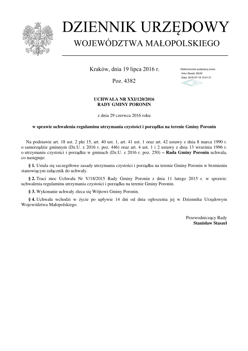 UCHWAŁA NR XXI/120/2016 RADY GMINY PORONIN z dnia 29 czerwca 2016 r.