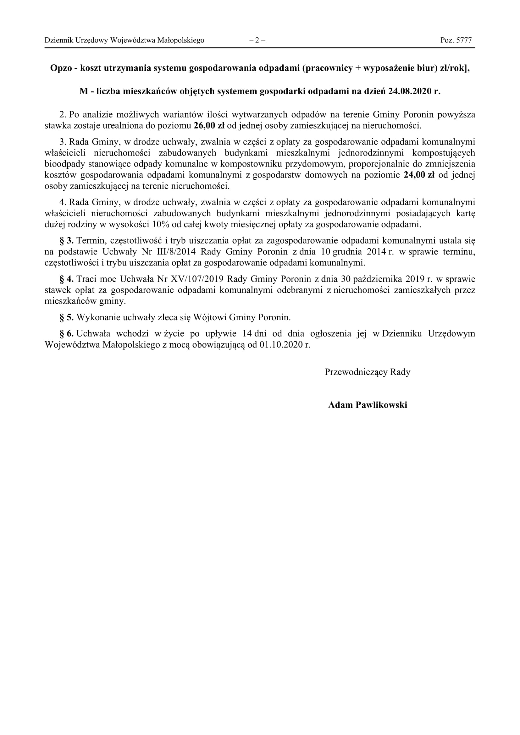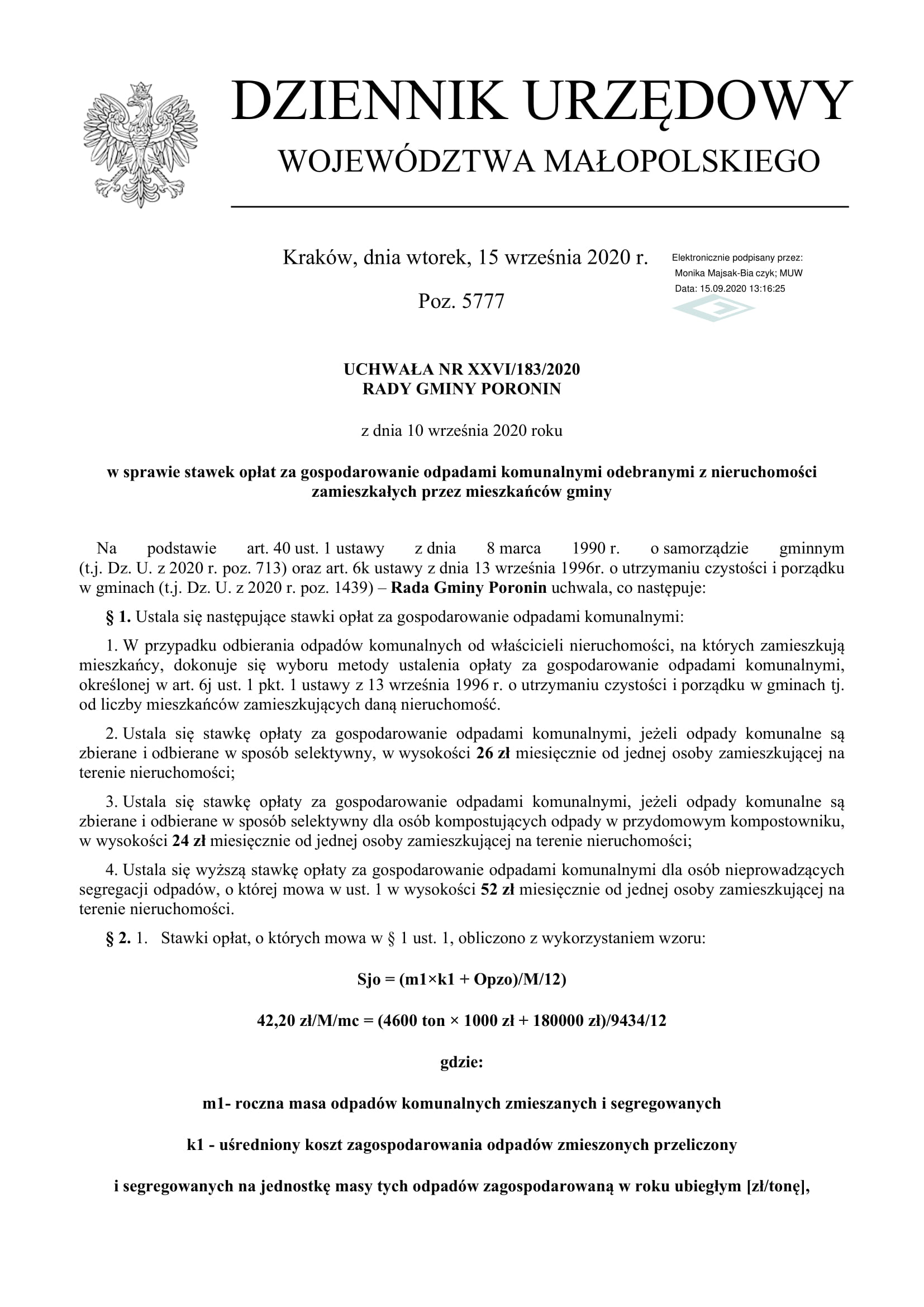 UCHWAŁA NR XXVI/183/2020 RADY GMINY PORONIN z dnia 10 września 2020 r.