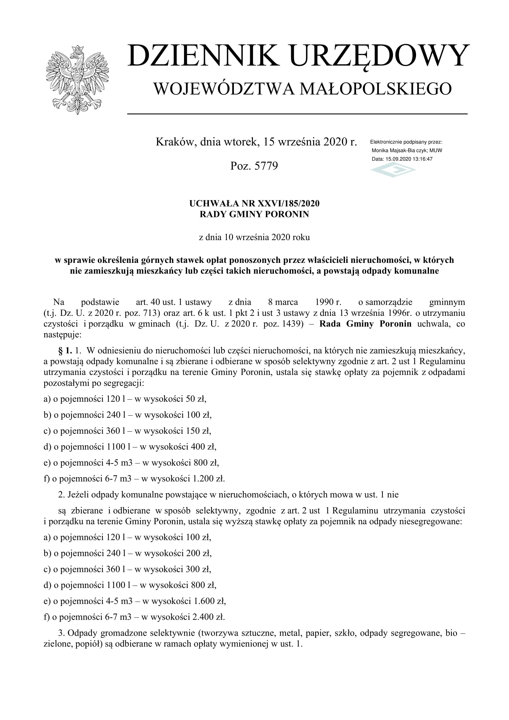 UCHWAŁA NR XXVI/185/2020 RADY GMINY PORONIN z dnia 10 września 2020 r.
